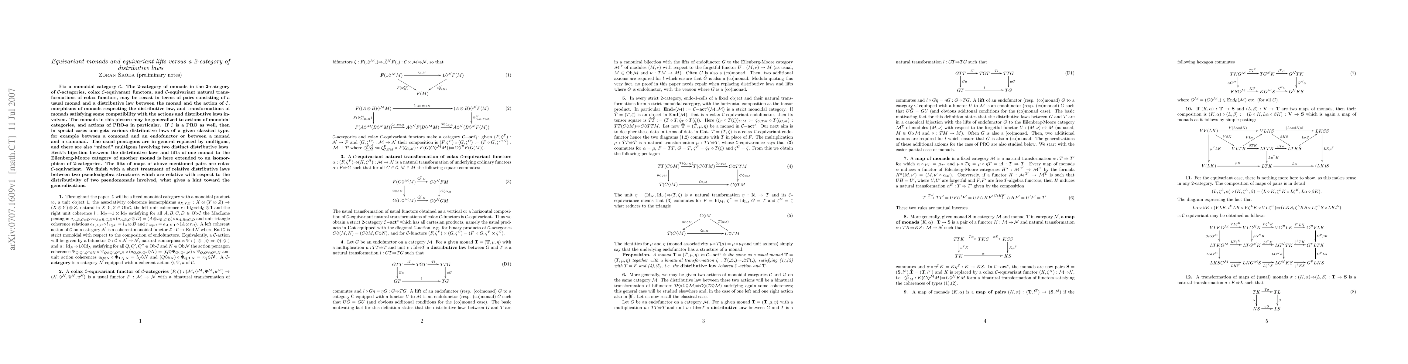 Fix a monoidal category C. The 2-category of monads in the 2-category of C-actegories, colax C-equivarant functors, and C-equivariant natural transformations of colax functors, may be recast in terms of pairs consisting of a usual monad and a distributive law between the monad and the action of C, morphisms of monads respecting the distributive law, and transformations of monads satisfying some compatibility with the actions and distributive laws involved. The monads in this picture may be generalized to actions of monoidal categories, and actions of PRO-s in particular. If C is a PRO as well, then in special cases one gets various distributive laws of a given classical type, for example between a comonad and an endofunctor or between a monad and a comonad. The usual pentagons are in general replaced by multigons, and there are also ``mixed'' multigons involving two distinct distributive laws. Beck's bijection between the distributive laws and lifts of one monad to the Eilenberg-Moore category of another monad is here extended to an isomorphism of 2-categories. The lifts of maps of above mentioned pairs are colax C-equivariant. We finish with a short treatment of relative distributive laws between two pseudoalgebra structures which are relative with respect to the distributivity of two pseudomonads involved, what gives a hint toward the generalizations.