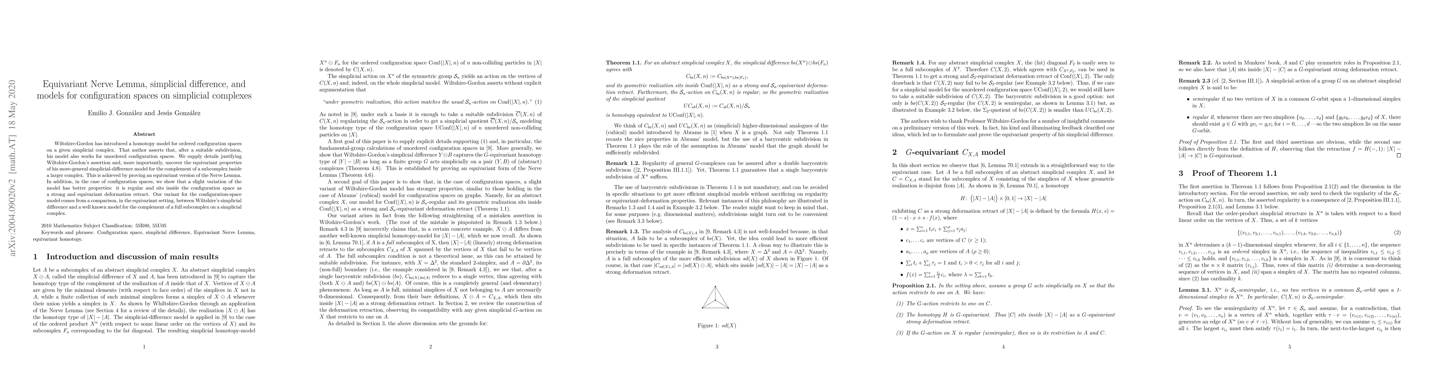 Wiltshire-Gordon has introduced a homotopy model for ordered configuration spaces on a given simplicial complex. That author asserts that, after a suitable subdivision, his model also works for unordered configuration spaces. We supply details justifying Wiltshire-Gordon's assertion and, more importantly, uncover the equivariant properties of his more-general simplicial-difference model for the complement of a subcomplex inside a larger complex. This is achieved by proving an equivariant version of the Nerve Lemma. In addition, in the case of configuration spaces, we show that a slight variation of the model has better properties: it is regular and sits inside the configuration space as a strong and equivariant deformation retract. Our variant for the configuration-space model comes from a comparison, in the equivariant setting, between Wiltshire's simplicial difference and a well known model for the complement of a full subcomplex on a simplicial complex.