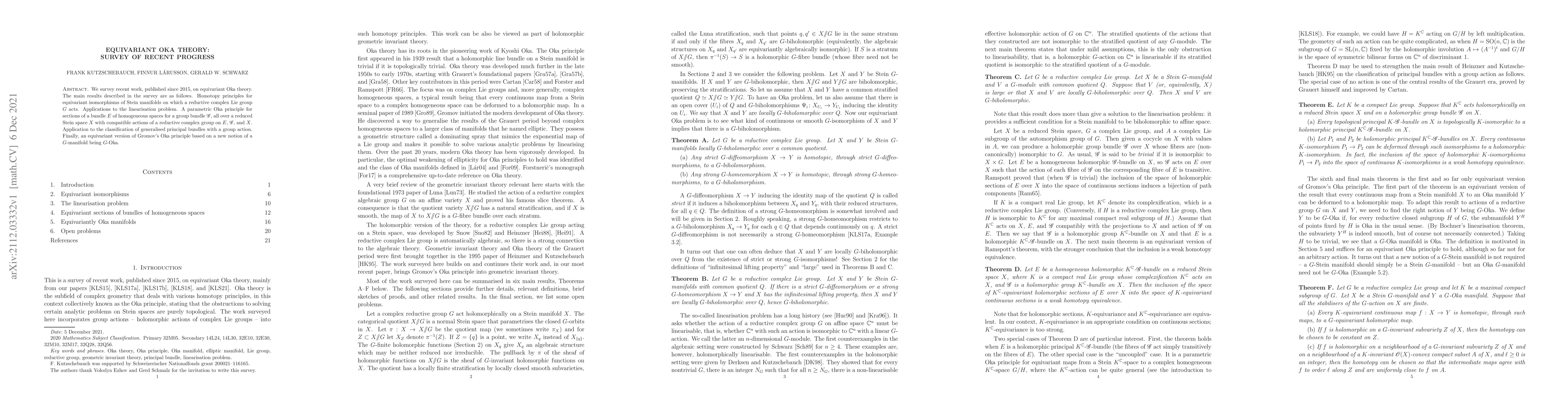 We survey recent work, published since 2015, on equivariant Oka theory. The main results described in the survey are as follows. Homotopy principles for equivariant isomorphisms of Stein manifolds on which a reductive complex Lie group $G$ acts. Applications to the linearisation problem. A parametric Oka principle for sections of a bundle $E$ of homogeneous spaces for a group bundle $\mathscr G$, all over a reduced Stein space $X$ with compatible actions of a reductive complex group on $E$, $\mathscr G$, and $X$. Application to the classification of generalised principal bundles with a group action. Finally, an equivariant version of Gromov's Oka principle based on a new notion of a $G$-manifold being $G$-Oka.