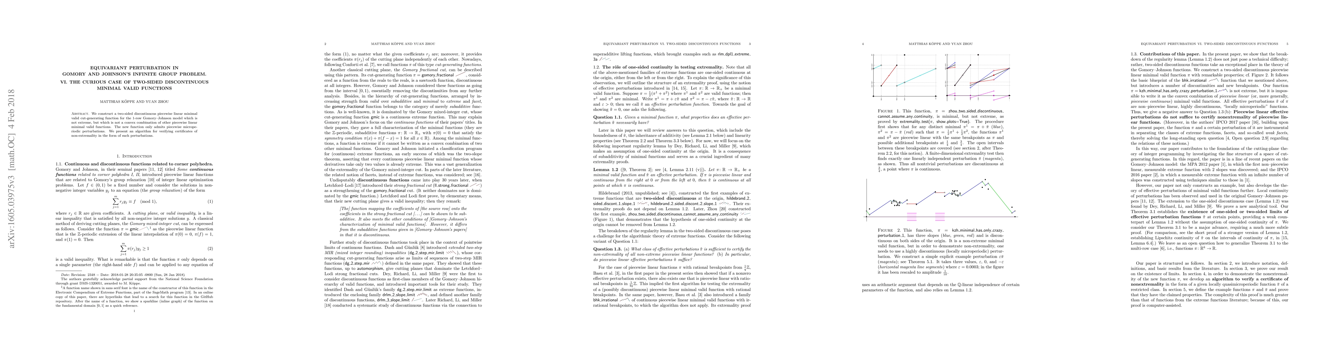 Summary: This paper constructs a two-sided discontinuous minimal valid function for the Gomory-Johnson model that is not extreme and cannot be expressed as a convex combination of other functions. It also introduces an algorithm for handling specific perturbations of this function.