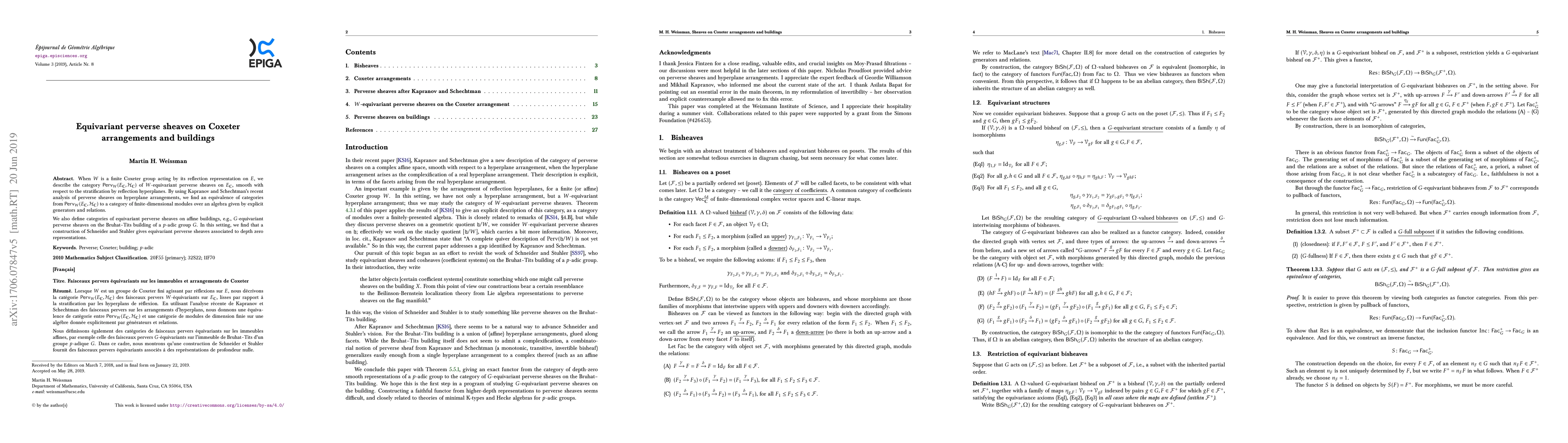 This paper establishes an equivalence between $W$-equivariant perverse sheaves on Coxeter arrangements and a category of finite-dimensional modules over an algebra defined by generators and relations. It further extends the discussion to equivariant perverse sheaves on affine buildings, linking them to Schneider and Stuhler's construction of depth zero representations.