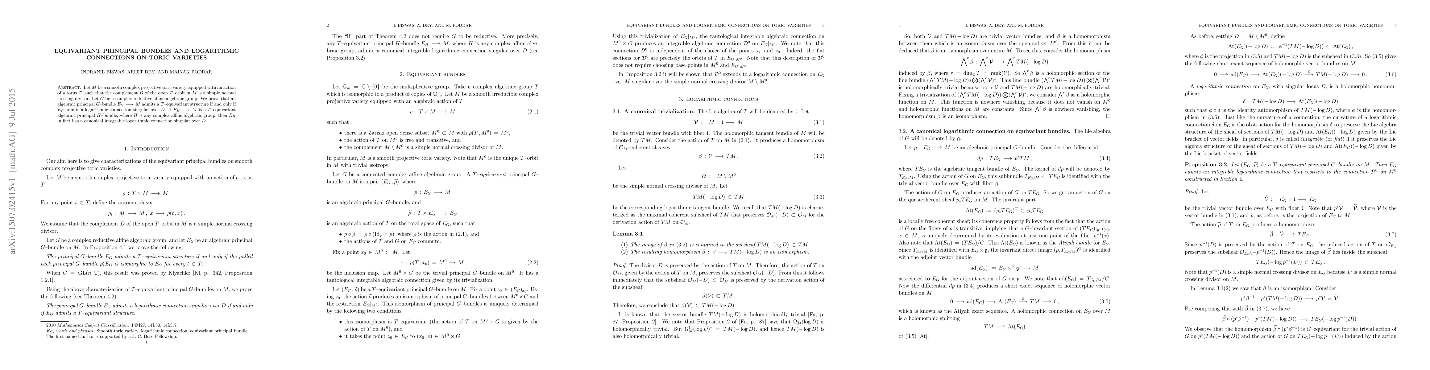 Let $M$ be a smooth complex projective toric variety equipped with an action of a torus $T$, such that the complement $D$ of the open $T$--orbit in $M$ is a simple normal crossing divisor. Let $G$ be a complex reductive affine algebraic group. We prove that an algebraic principal $G$--bundle $E_G\to M$ admits a $T$--equivariant structure if and only if $E_G$ admits a logarithmic connection singular over $D$. If $E_H\to M$ is a $T$-equivariant algebraic principal $H$--bundle, where $H$ is any complex affine algebraic group, then $E_H$ in fact has a canonical integrable logarithmic connection singular over $D$.