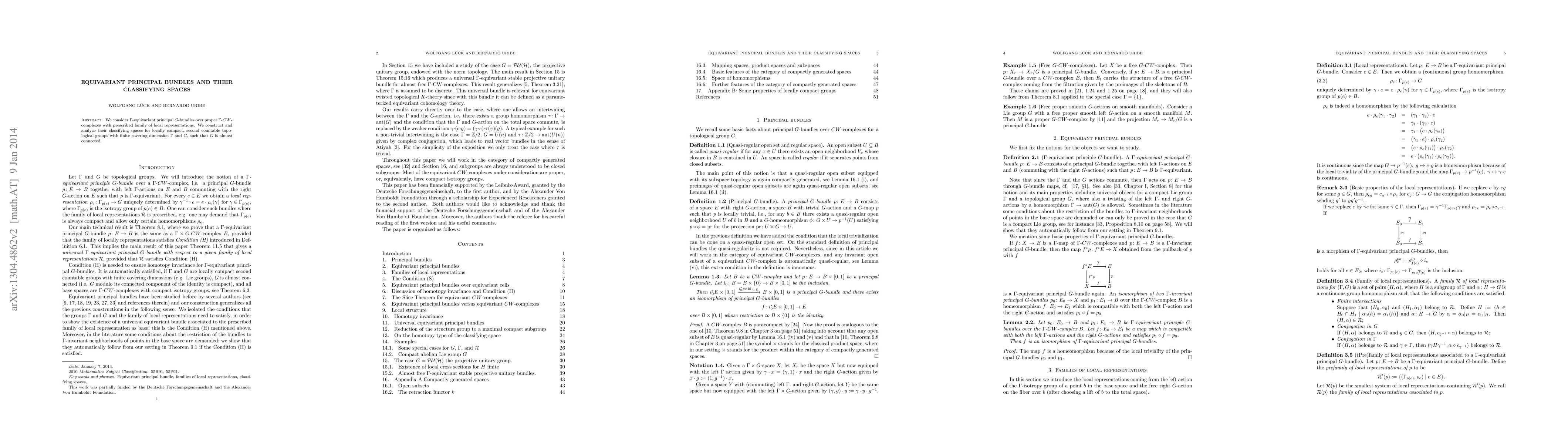This paper explores \Gamma-equivariant principal G-bundles over proper \Gamma-CW-complexes, focusing on constructing and analyzing their classifying spaces for locally compact, second countable groups \Gamma and G, where G is almost connected. The study emphasizes the prescribed family of local representations in the context of these bundles.
