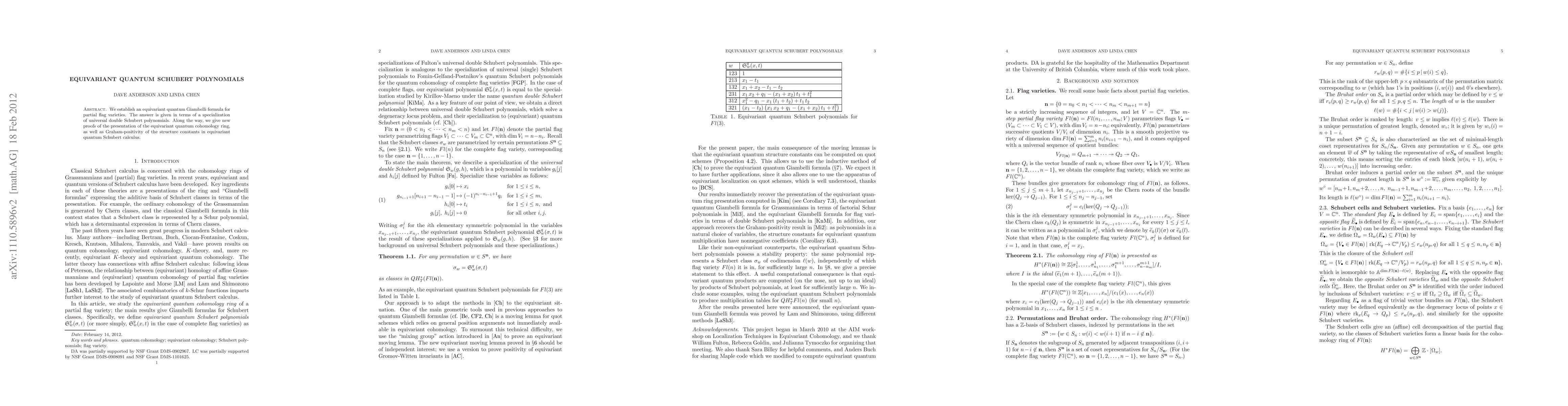 This paper establishes an equivariant quantum Giambelli formula for partial flag varieties using universal double Schubert polynomials and provides new proofs for the presentation of the equivariant quantum cohomology ring and Graham-positivity of its structure constants.