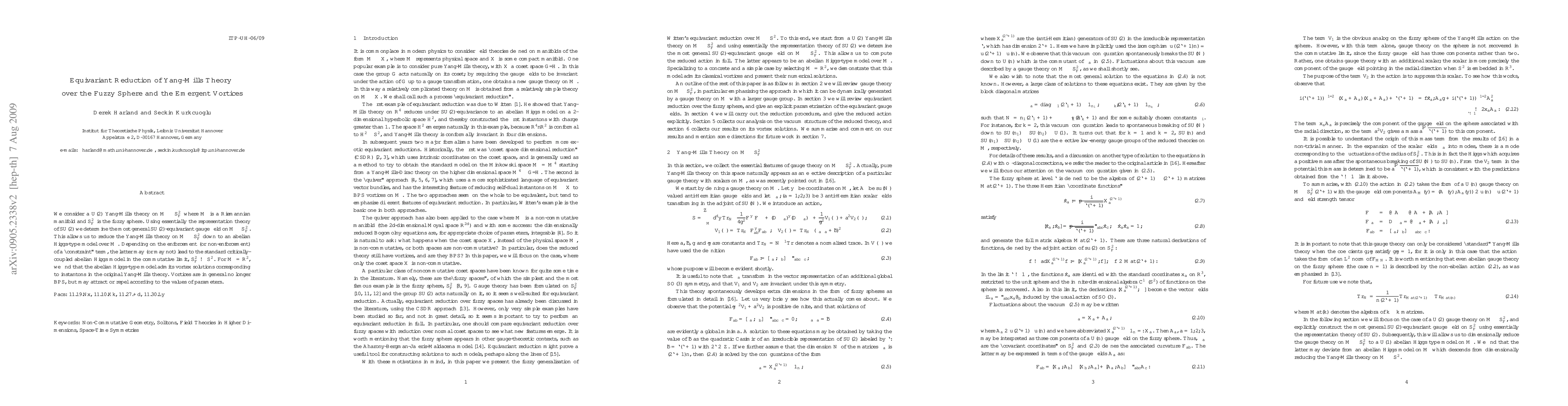 We consider a U(2) Yang-Mills theory on M x S_F^2 where M is a Riemannian manifold and S_F^2 is the fuzzy sphere. Using essentially the representation theory of SU(2) we determine the most general SU(2)-equivariant gauge field on M x S_F^2. This allows us to reduce the Yang-Mills theory on M x S_F^2 down to an abelian Higgs-type model over M. Depending on the enforcement (or non-enforcement) of a "constraint" term, the latter may (or may not) lead to the standard critically-coupled abelian Higgs model in the commutative limit, S_F^2 -> S^2. For M = R^2, we find that the abelian Higgs-type model admits vortex solutions corresponding to instantons in the original Yang-Mills theory. Vortices are in general no longer BPS, but may attract or repel according to the values of parameters.
