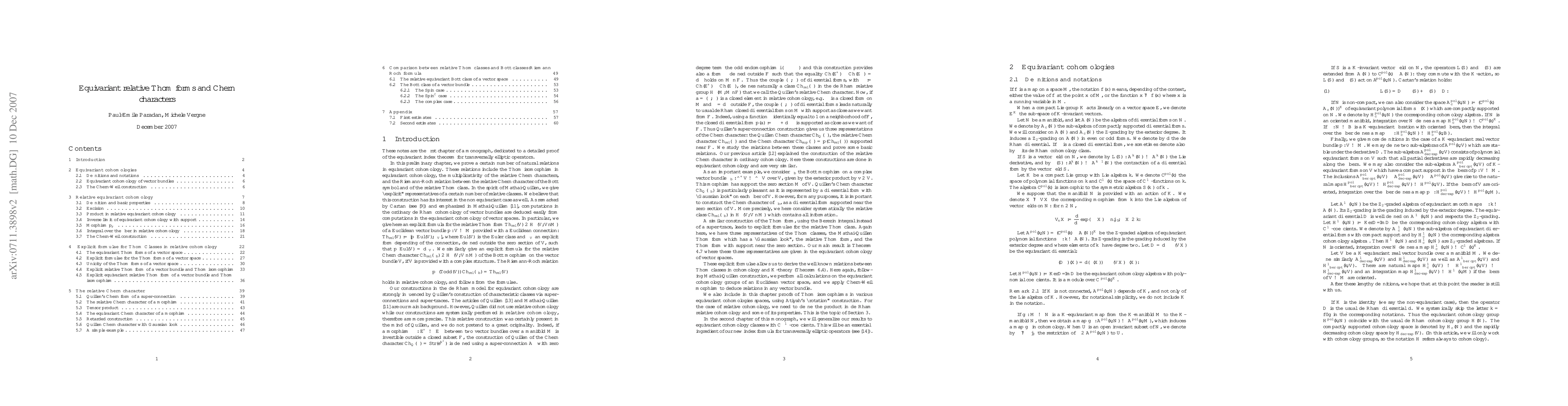 Summary: This chapter proves foundational relations in equivariant cohomology, establishing the Thom isomorphism, the multiplicativity of relative Chern characters, and the Riemann-Roch relation essential for the equivariant index theorem proof in the monograph.