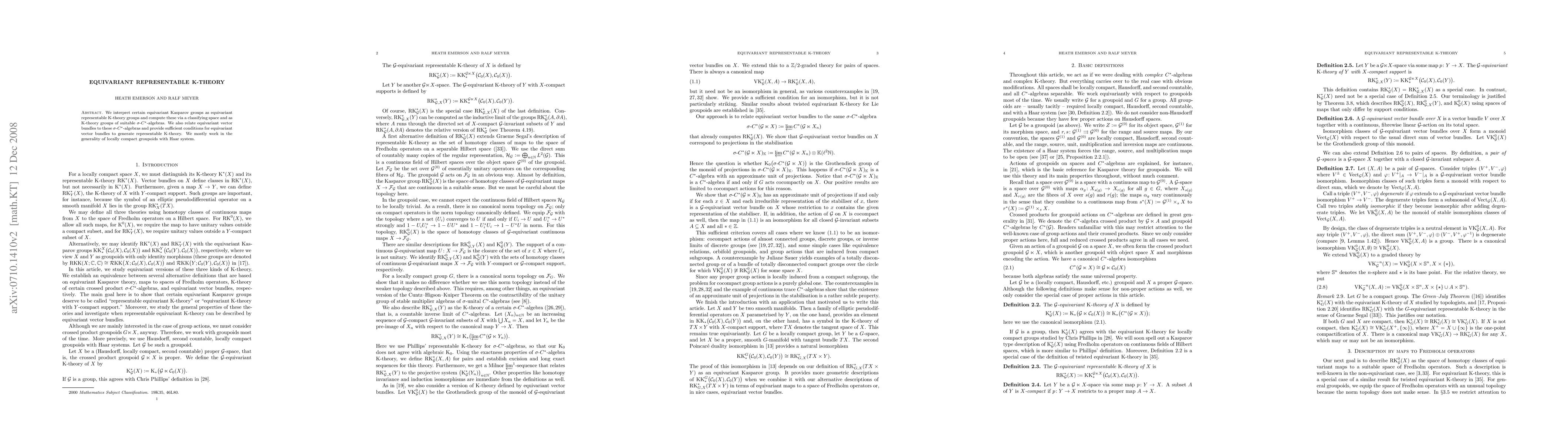 This paper interprets equivariant Kasparov groups as equivariant representable K-theory, computes these groups through classifying spaces and sigma-C*-algebras, and establishes conditions for equivariant vector bundles to generate representable K-theory in the context of locally compact groupoids with Haar systems.