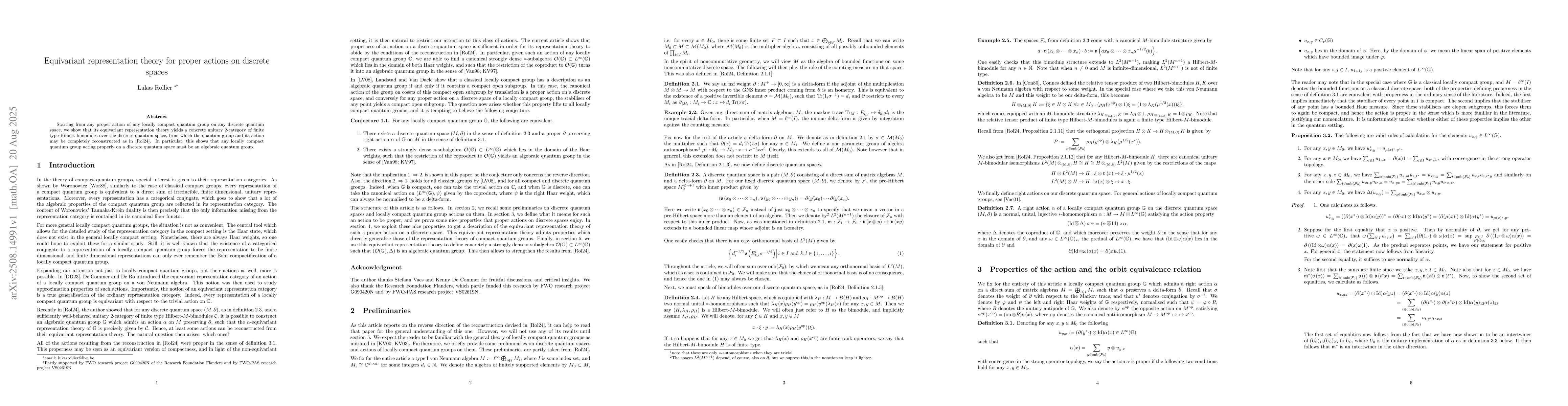 Starting from any proper action of any locally compact quantum group on any discrete quantum space, we show that its equivariant representation theory yields a concrete unitary 2-category of finite type Hilbert bimodules over the discrete quantum space, from which the quantum group and its action may be completely reconstructed as in a previous article by the author. In particular, this shows that any locally compact quantum group acting properly on a discrete quantum space must be an algebraic quantum group.