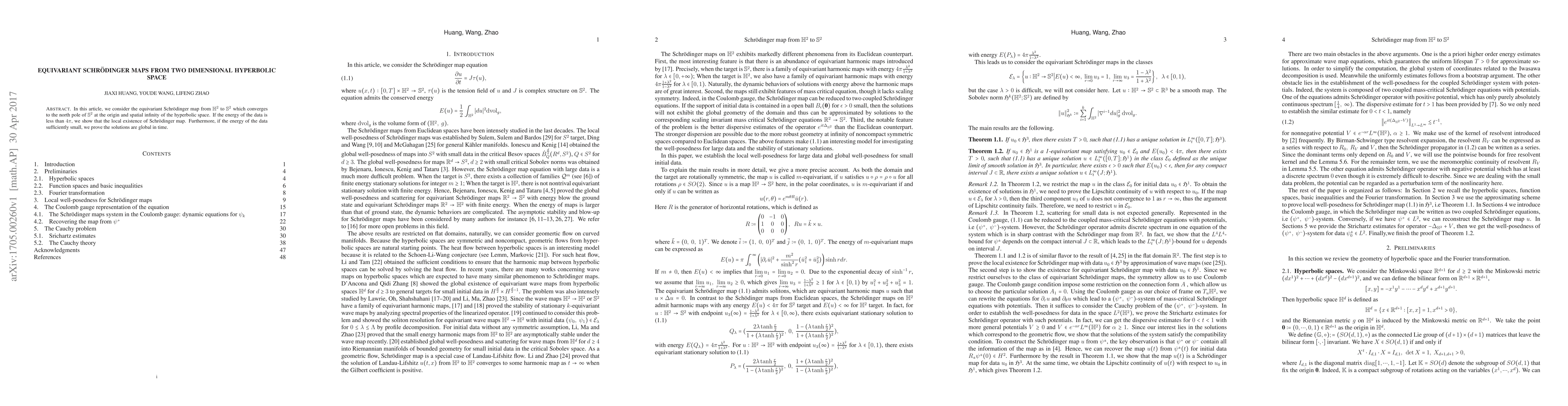This paper investigates equivariant Schrödinger maps from 2D hyperbolic space ($\Bbb H^2$) to the 2D sphere ($\Bbb S^2$), proving local existence when the energy of the data is below $4\pi$, and global existence for sufficiently small energy.