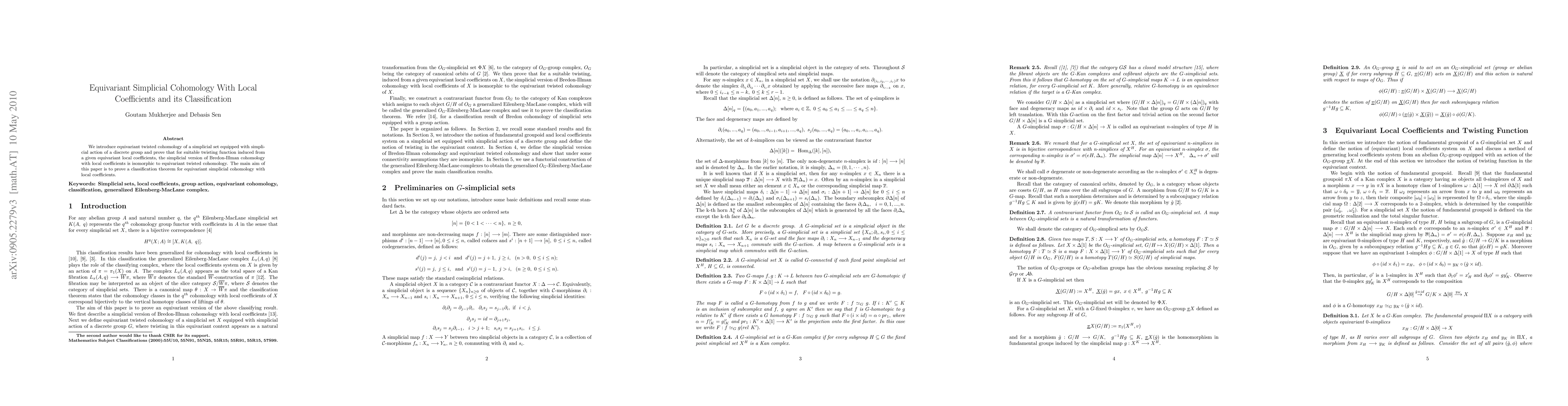 This paper introduces equivariant twisted cohomology for simplicial sets with group actions and shows its equivalence to Bredon-Illman cohomology with local coefficients. The main result is a classification theorem for equivariant simplicial cohomology with local coefficients.
