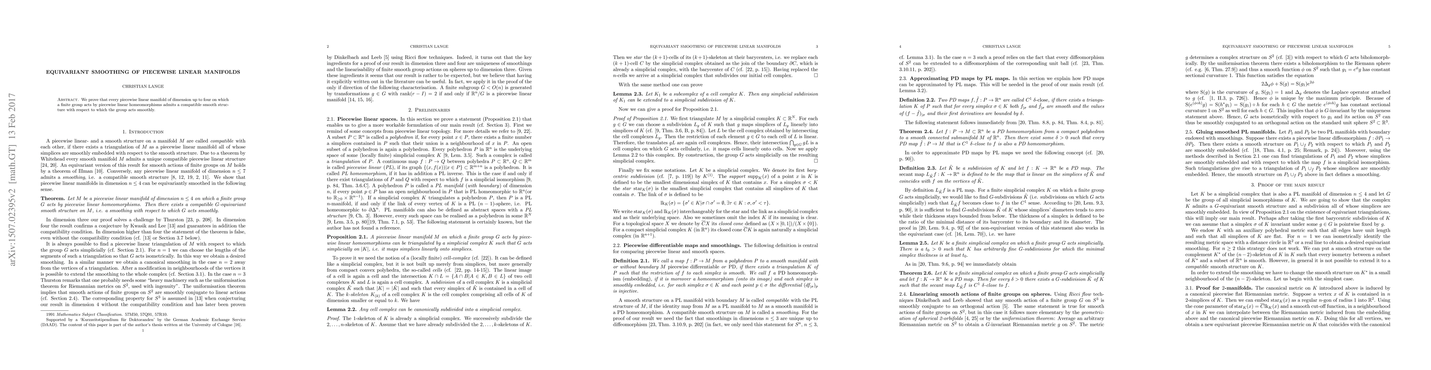 The paper proves the existence of compatible smooth structures on piecewise linear manifolds of dimension up to four under the action of finite groups by piecewise linear homeomorphisms, using techniques such as equivariant smoothing, approximation of piecewise differentiable maps by piecewise linear ones, and linearization of smooth actions of finite groups on spheres.