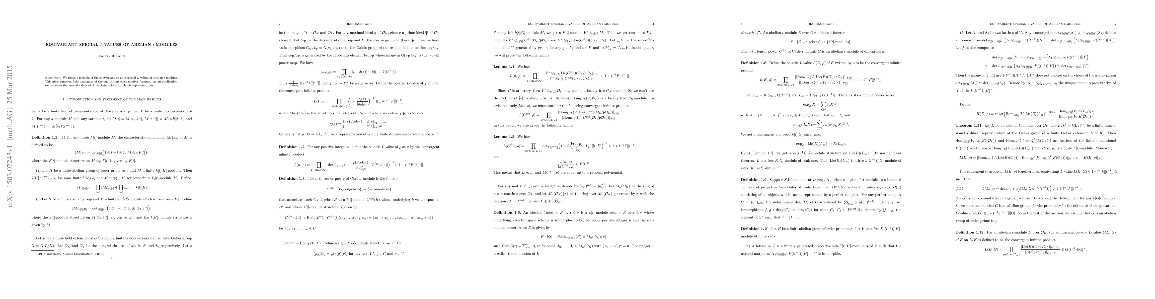 This paper establishes a formula for equivariant infinity-adic special L-values of abelian t-modules, providing function field analogues of the equivariant class number formula, and applies it to compute special values of Artin L-functions for Galois representations.