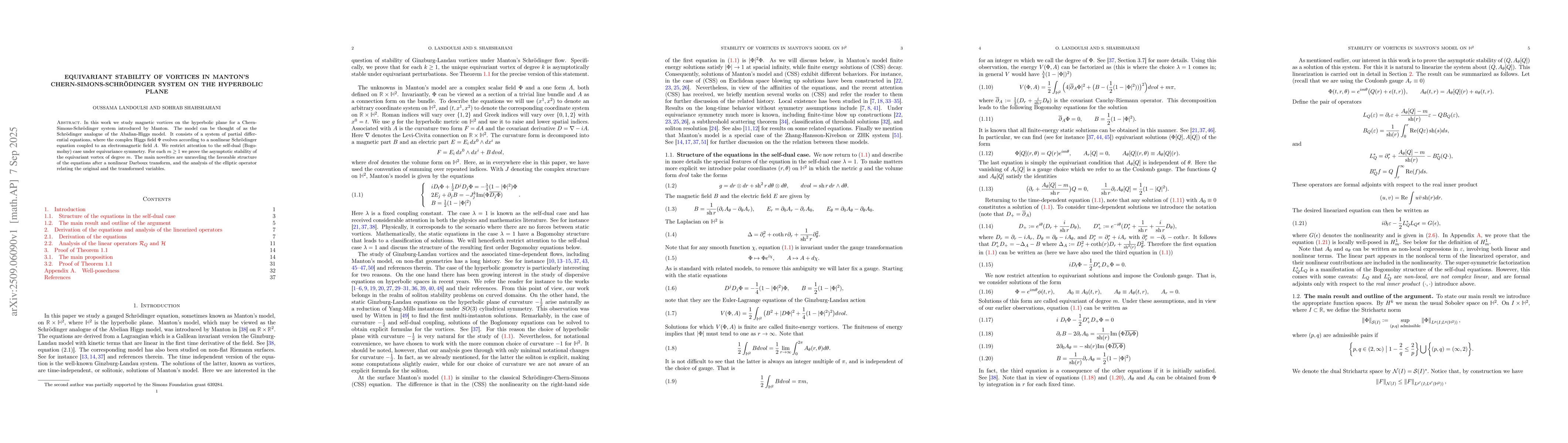 In this work we study magnetic vortices on the hyperbolic plane for a Chern-Simons-Schr\"odinger system introduced by Manton. The model can be thought of as the Schr\"odinger analogue of the Abalian-Higgs model. It consists of a system of partial differential equations, where the complex Higgs field $\Phi$ evolves according to a nonlinear Schr\"odinger equation coupled to an electromagnetic field $A$. We restrict attention to the self-dual (Bogomolny) case under equivariance symmetry. For each $m\geq 1$ we prove the asymptotic stability of the equivariant vortex of degree $m$. The main novelties are unraveling the favorable structure of the equations after a nonlinear Darboux transform, and the analysis of the elliptic operator relating the original and the transformed variables.