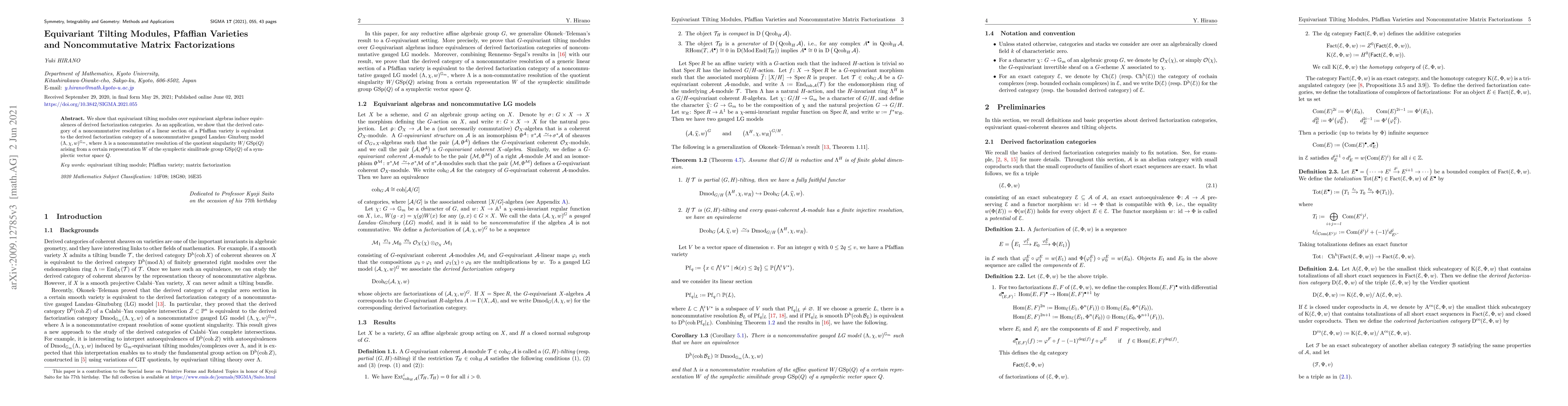 We show that equivariant tilting modules over equivariant algebras induce equivalences of derived factorization categories. As an application, we show that the derived category of a noncommutative resolution of a linear section of a Pfaffian variety is equivalent to the derived factorization category of a noncommutative gauged Landau-Ginzburg model $(\Lambda,\chi, w)^{\mathbb{G}_m}$, where $\Lambda$ is a noncommutative resolution of the quotient singularity $W/\operatorname{GSp}(Q)$ arising from a certain representation $W$ of the symplectic similitude group $\operatorname{GSp}(Q)$ of a symplectic vector space $Q$.