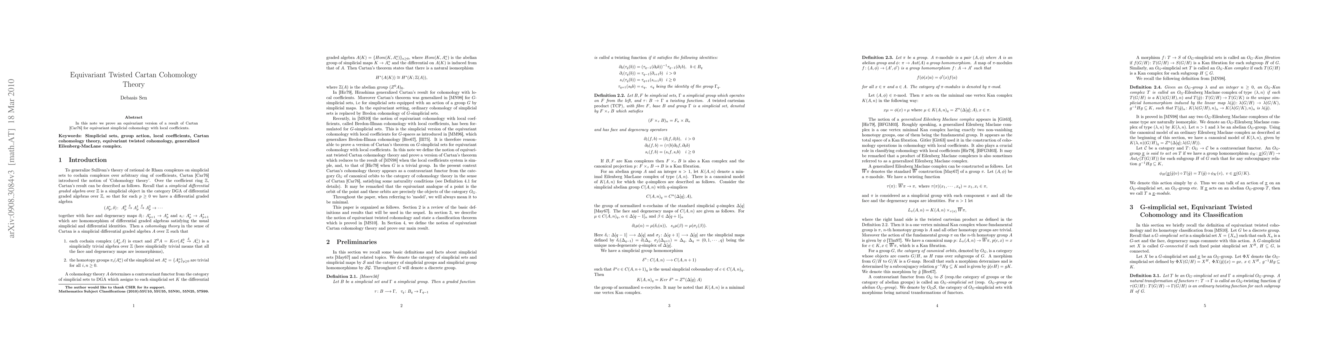 Summary: This paper establishes an equivariant extension of Cartan's theorem, applying it to equivariant simplicial cohomology with local coefficients, advancing the understanding of symmetry in cohomology theories.