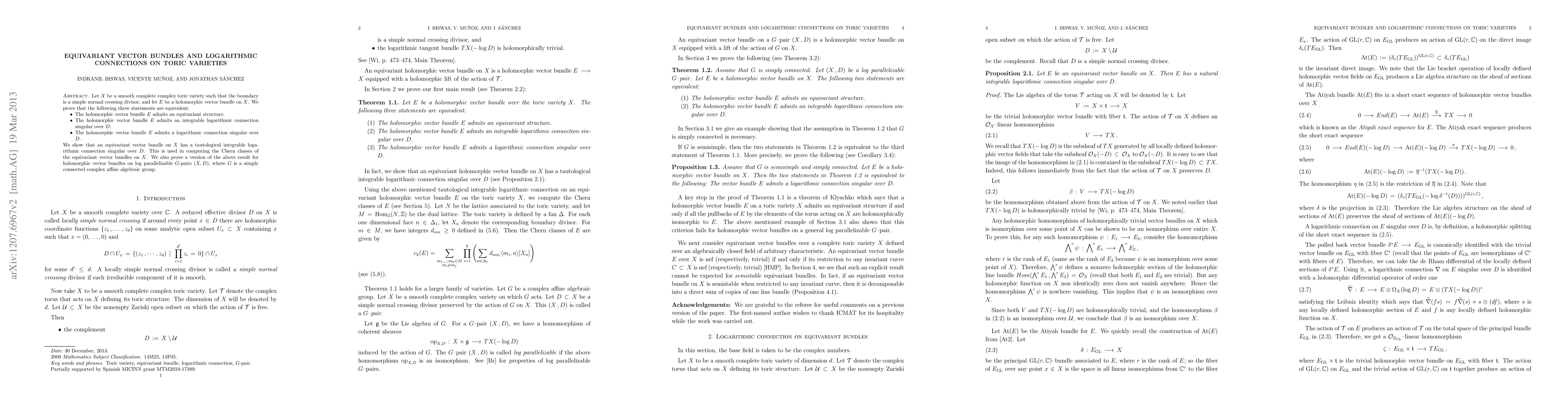 This paper proves that on smooth complete toric varieties with simple normal crossing boundaries, a holomorphic vector bundle admits an equivariant structure if and only if it has a logarithmic connection singular over the boundary. This result is extended to log parallelizable G-pairs, where G is a simply connected complex affine algebraic group.