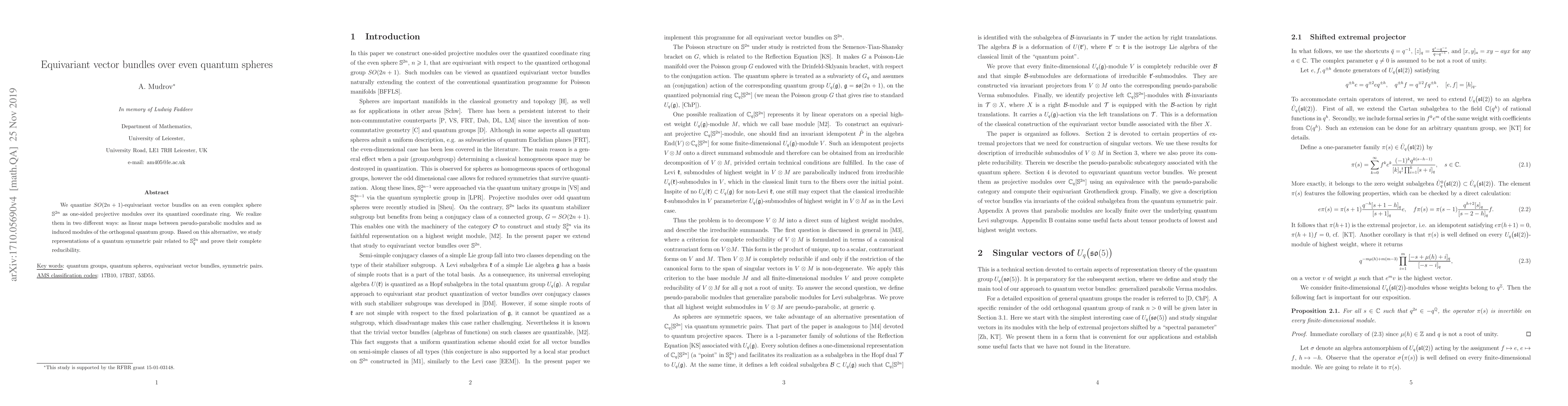 This research quantizes homogeneous vector bundles over even complex spheres using one-sided projective modules over their quantized rings. It presents two realizations: as locally finite C-homs between pseudo-parabolic Verma modules and as induced modules of the quantum orthogonal group. The study further explores representations of a quantum symmetric pair related to these spheres, proving their complete reducibility.
