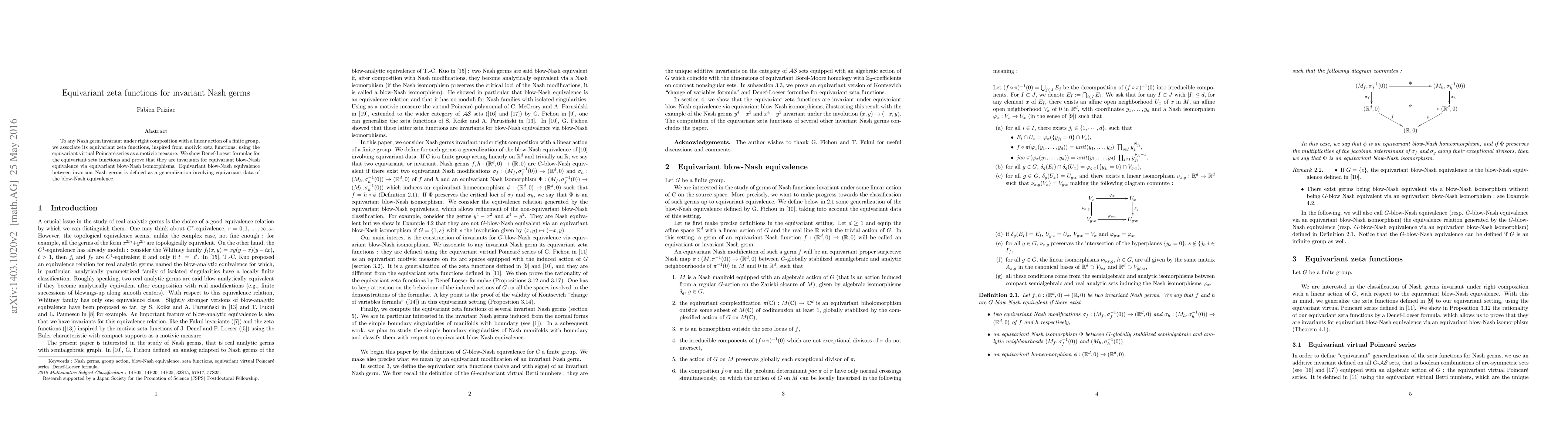 This paper associates equivariant zeta functions to Nash germs invariant under a finite group's action, utilizing equivariant virtual Poincaré series as a motivic measure. It proves Denef-Loeser formulae and shows these functions are invariants under equivariant blow-Nash equivalence.