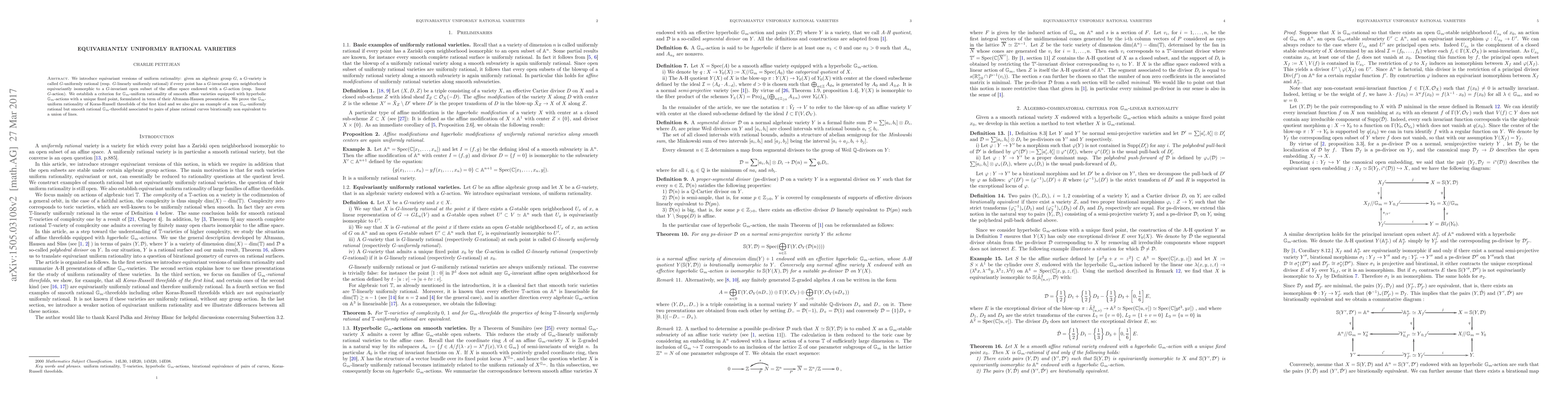 This paper explores equivariant versions of uniform rationality for G-varieties, establishing criteria for Gm-uniform rationality using Altmann-Hausen presentations. It proves the Gm-uniform rationality of Koras-Russel threefolds and provides examples of smooth rational Gm-threefolds that are not Gm-uniformly rational.