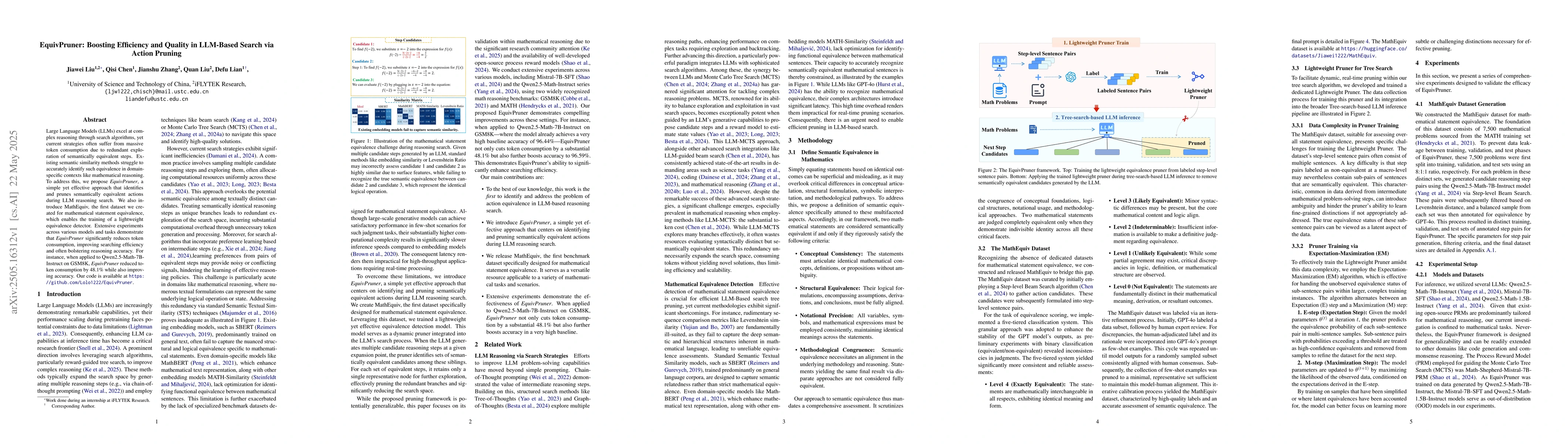 EquivPruner, a novel action pruning method for LLM-based search, and MathEquiv, a dataset for training an equivalence detector in mathematical contexts.