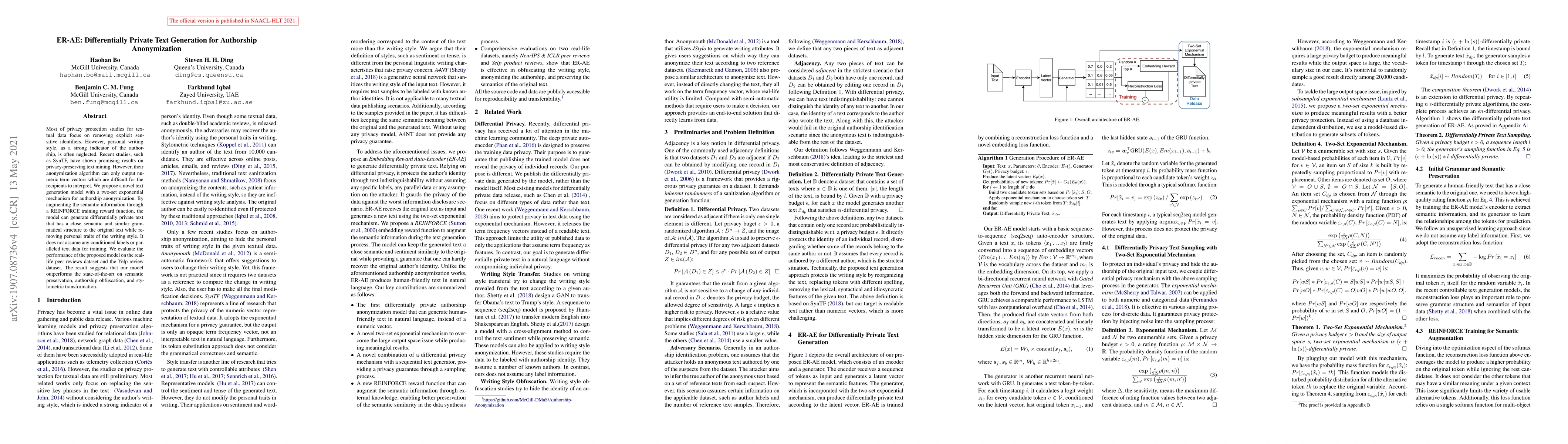 This paper proposes a novel differentially private text generation model for authorship anonymization that uses a two-set exponential mechanism and REINFORCE training to preserve semantic and grammatical structures while removing personal writing style traits. The model outperforms existing methods on datasets like peer reviews and Yelp reviews.