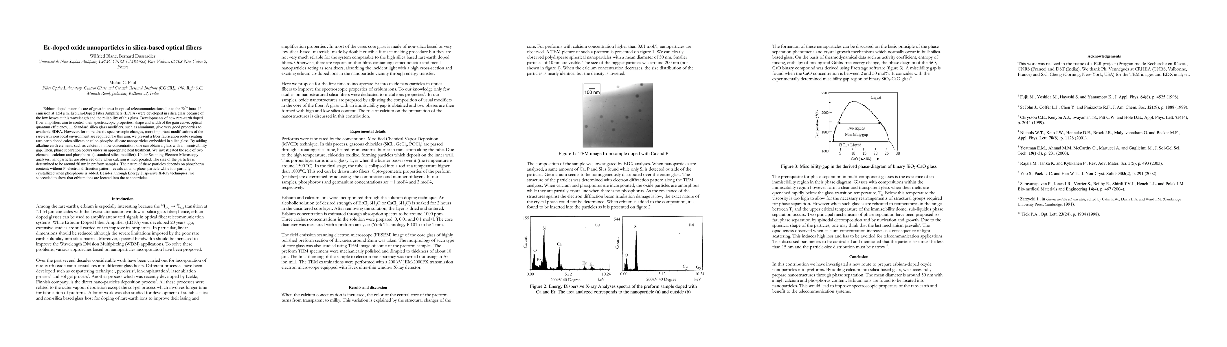 Erbium doped materials are of great interest in optical telecommunications due to the Er3+ intra-4f emission at 1.54 ?m. Erbium doped fibre amplifiers (EDFA) were developed in silica glass because of the low losses at this wavelength and the reliability of this glass. Developments of new rare earth doped fibre amplifiers aim to control their spectroscopic properties including shape and width of the gain curve and optical quantum efficiency. Standard silica glass modifiers, such as aluminium, result in very good properties in current EDFA. However, for more drastic spectroscopic changes, more important modifications of the rare earth ions local environment are required. To address this aim, we present a fibre fabrication route creating rare earth doped calcia?silica or calcia?phosphosilica nanoparticles embedded in silica glass. By adding alkaline earth elements such as calcium, in low concentration, one can obtain a glass with an immisci- bility gap so that phase separation occurs with an appropriate heat treatment. We investigated the role of two elements: calcium and phosphorus (a standard silica modifier). Scanning electron microscopy shows that nanoparticles are only observed when calcium is incorporated. The size of the particles is determined to be around 50 nm in preform samples. The nature of these particles depends on phosphorus content: without P, electron diffraction shows that the particles are amorphous whilst they are partially crystalline when phosphorus is added. In addition through use of energy dispersive x-ray techniques, we have shown that erbium ions are located in the nanoparticles.