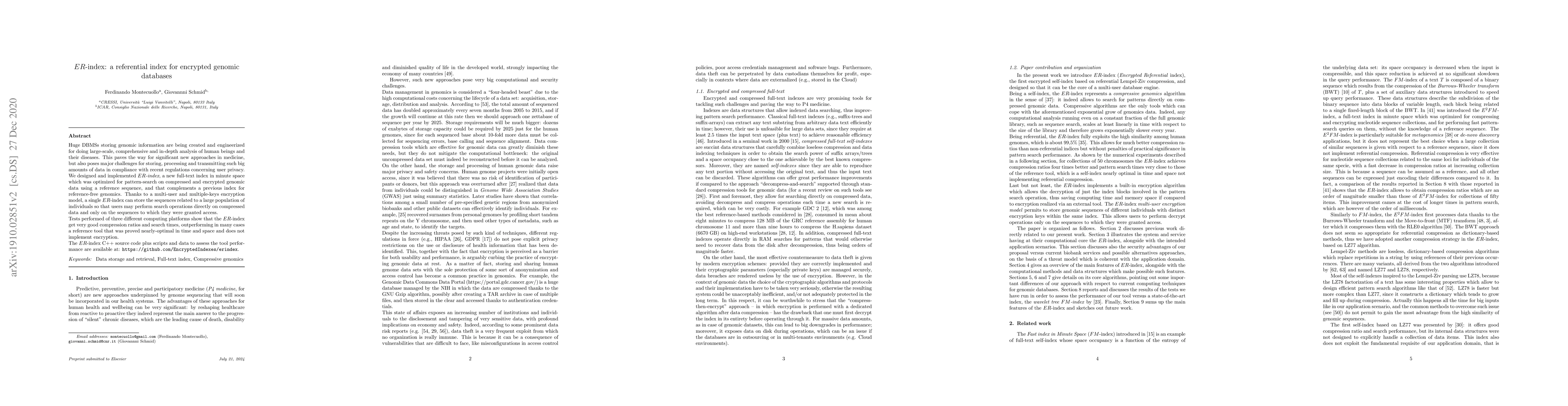 Huge DBMSs storing genomic information are being created and engineerized for doing large-scale, comprehensive and in-depth analysis of human beings and their diseases. However, recent regulations like the GDPR require that sensitive data are stored and elaborated thanks to privacy-by-design methods and software. We designed and implemented ER-index, a new full-text index in minute space which was optimized for compressing and encrypting collections of genomic sequences, and for performing on them fast pattern-search queries. Our new index complements the E2FM-index, which was introduced to compress and encrypt collections of nucleotide sequences without relying on a reference sequence. When used on collections of highly similar sequences, the ER-index allows to obtain compression ratios which are an order of magnitude smaller than those achieved with the E2FM-index, but maintaining its very good search performance. Moreover, thanks to the ER-index multi-user and multiple-keys encryption model, a single index can store the sequences related to a population of individuals so that users may perform search operations only on the sequences to which they were granted access. The ER-index C++ source code plus scripts and data to assess the tool performance are available at: https://github.com/EncryptedIndexes/erindex.