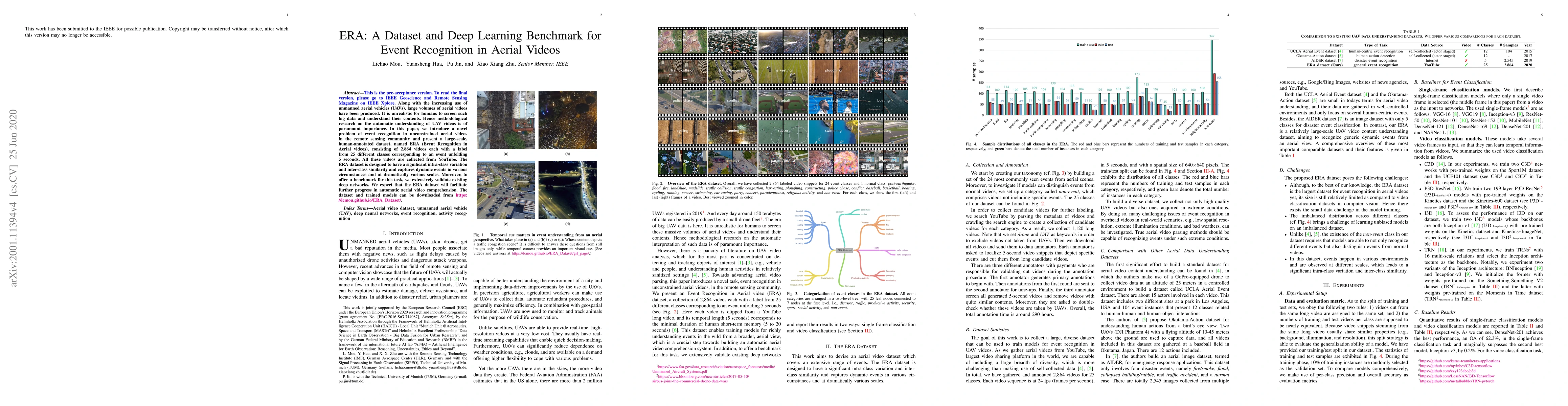 This paper introduces ERA, a large-scale dataset for event recognition in aerial videos, consisting of 2,864 videos labeled into 25 classes. It aims to advance automatic understanding of UAV videos and provides a benchmark for deep learning models.