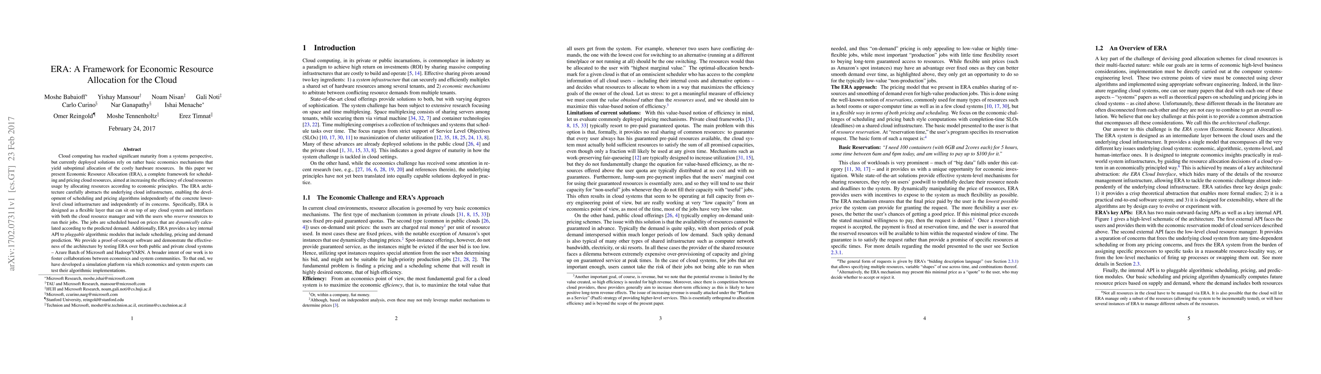 The paper introduces ERA, a framework for economic resource allocation in cloud computing to optimize resource usage through dynamic pricing and scheduling. ERA abstracts cloud infrastructure, allowing independent development of algorithms, and is tested on Azure Batch and Hadoop/YARN, demonstrating its effectiveness.