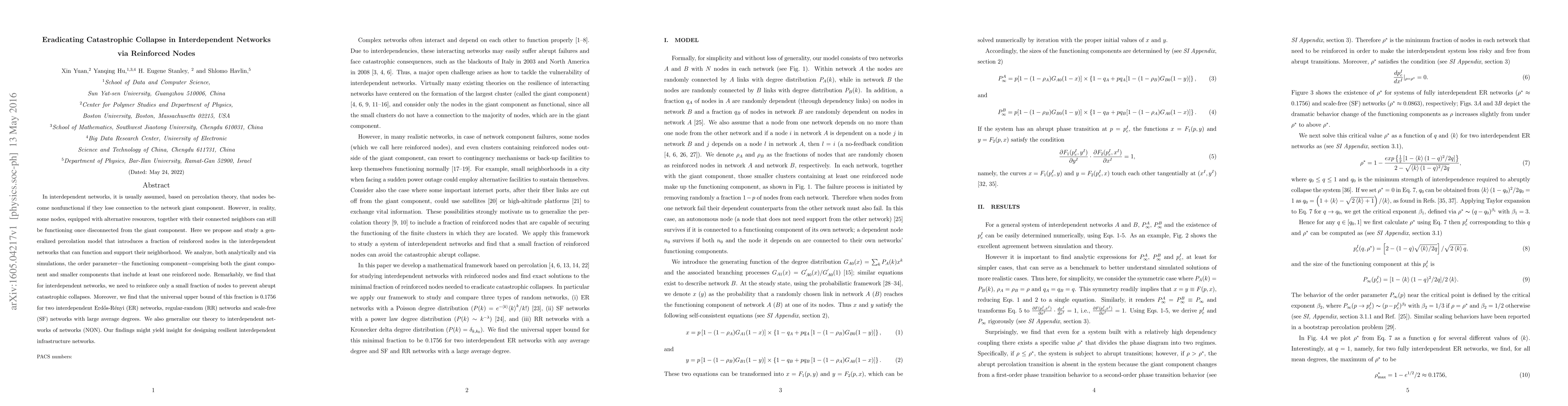 This paper proposes a generalized percolation model for interdependent networks that includes reinforced nodes capable of maintaining functionality even when disconnected from the main network. The study finds that reinforcing only a small fraction of nodes (up to 0.1756) can prevent catastrophic collapses, offering insights for designing resilient infrastructure networks.