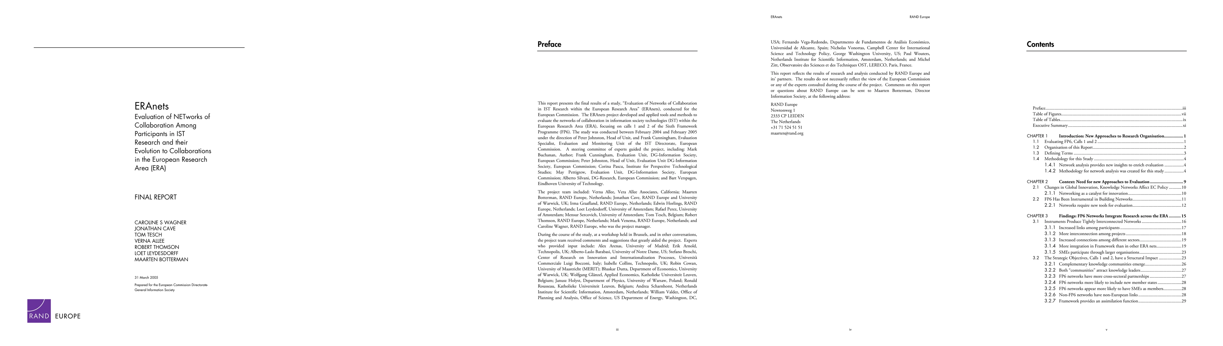 This study evaluates collaboration networks in information society technologies (IST) within the European Research Area (ERA), assessing their development and evolution, and provides tools and methods for future evaluations. The findings are based on the ERAnets project, which analyzed collaborations from the Sixth Framework Programme (FP6) calls 1 and 2.