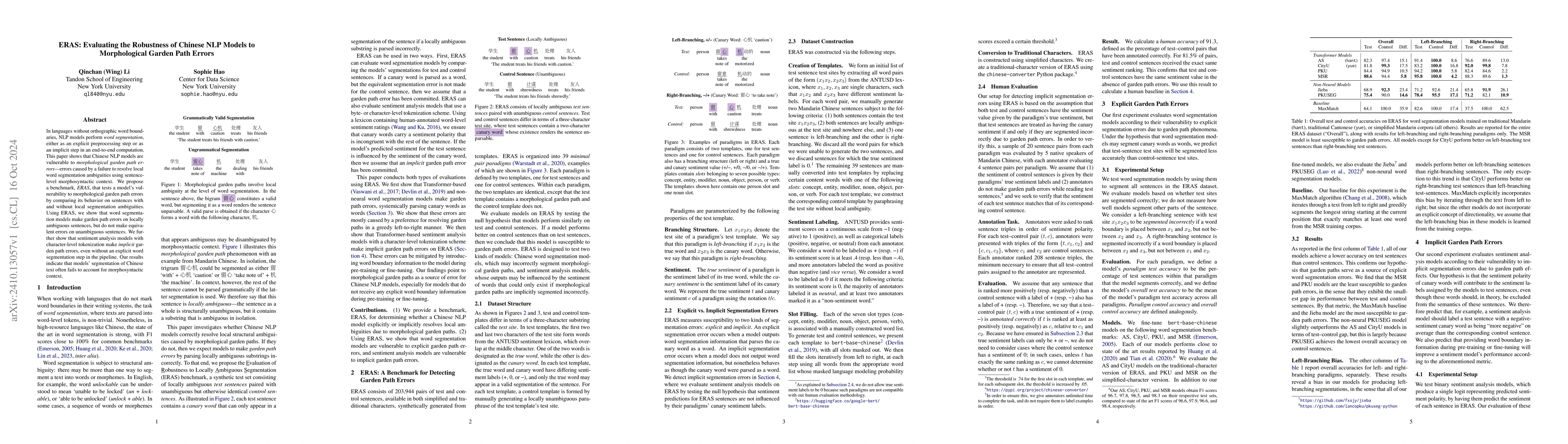 This paper evaluates the robustness of Chinese NLP models to morphological garden path errors, demonstrating that models struggle with local word segmentation ambiguities without sentence-level context. A new benchmark, ERAS, reveals that word segmentation and sentiment analysis models both make errors in ambiguous sentences, highlighting their failure to integrate morphosyntactic context.