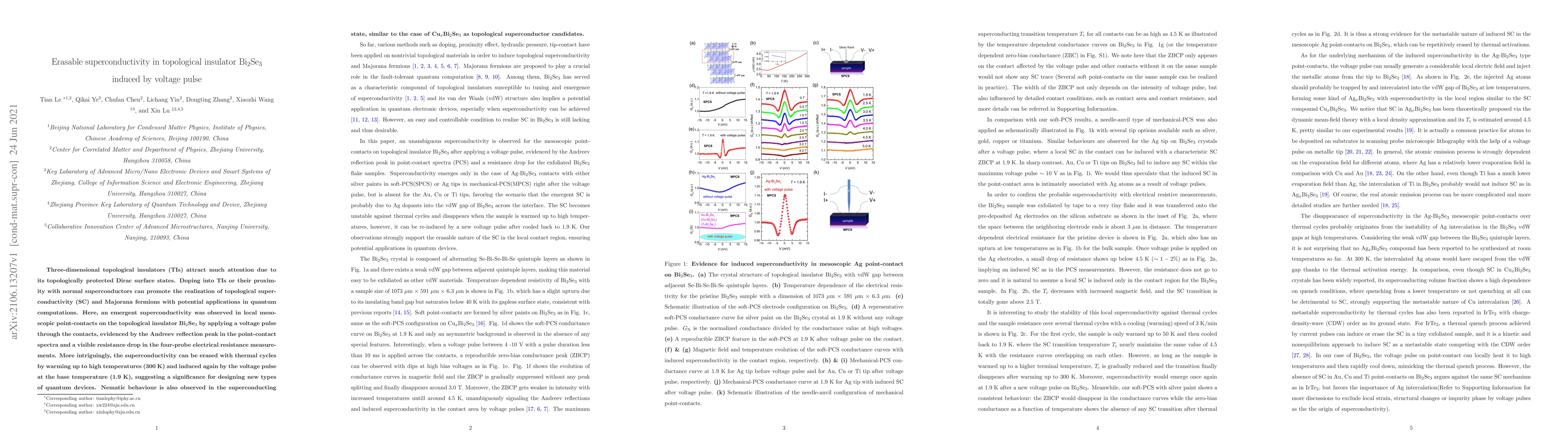 This study demonstrates the induction of erasable superconductivity in the topological insulator Bi2Se3 via voltage pulses, evidenced by Andreev reflection and resistance drop, and reveals its potential for quantum device applications. The induced superconductivity can be erased by thermal cycling and reactivated by voltage pulses, showcasing nematic behavior akin to CuxBi2Se3.