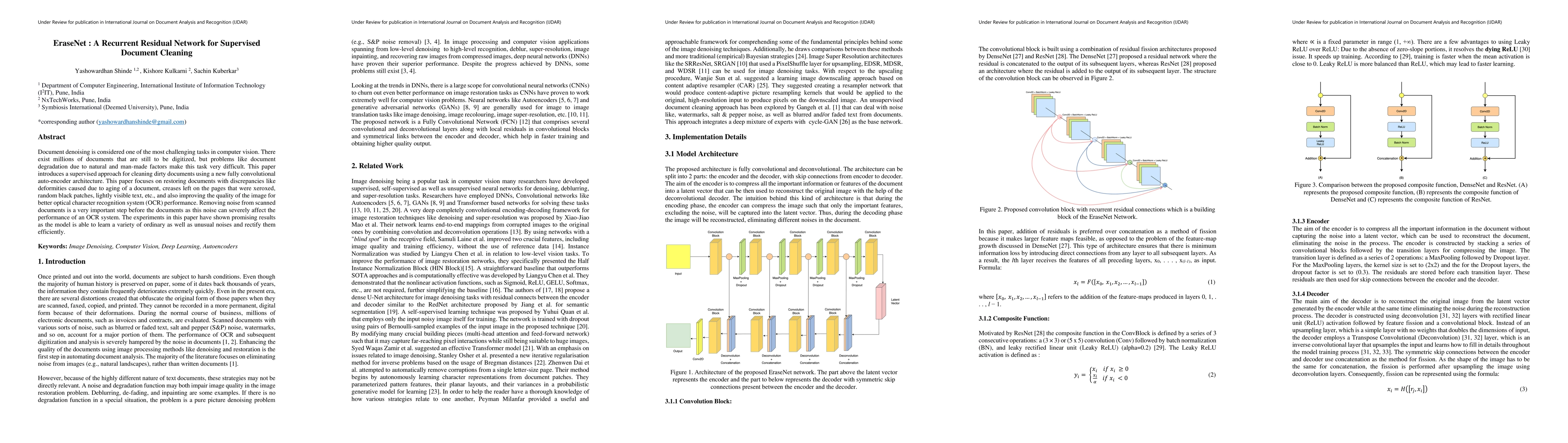 EraseNet employs a recurrent residual network for cleaning scanned documents, addressing issues like aging, creases, and random noise to enhance OCR performance. Experimental results demonstrate the model's effectiveness in learning and removing diverse types of noise.