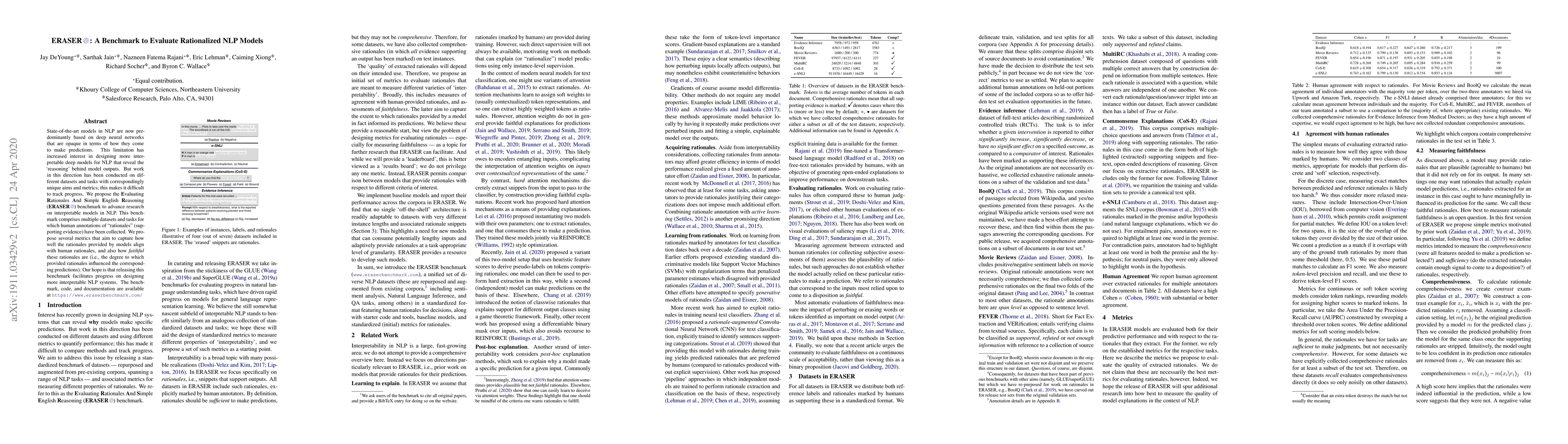 State-of-the-art models in NLP are now predominantly based on deep neural networks that are opaque in terms of how they come to make predictions. This limitation has increased interest in designing more interpretable deep models for NLP that reveal the `reasoning' behind model outputs. But work in this direction has been conducted on different datasets and tasks with correspondingly unique aims and metrics; this makes it difficult to track progress. We propose the Evaluating Rationales And Simple English Reasoning (ERASER) benchmark to advance research on interpretable models in NLP. This benchmark comprises multiple datasets and tasks for which human annotations of "rationales" (supporting evidence) have been collected. We propose several metrics that aim to capture how well the rationales provided by models align with human rationales, and also how faithful these rationales are (i.e., the degree to which provided rationales influenced the corresponding predictions). Our hope is that releasing this benchmark facilitates progress on designing more interpretable NLP systems. The benchmark, code, and documentation are available at https://www.eraserbenchmark.com/