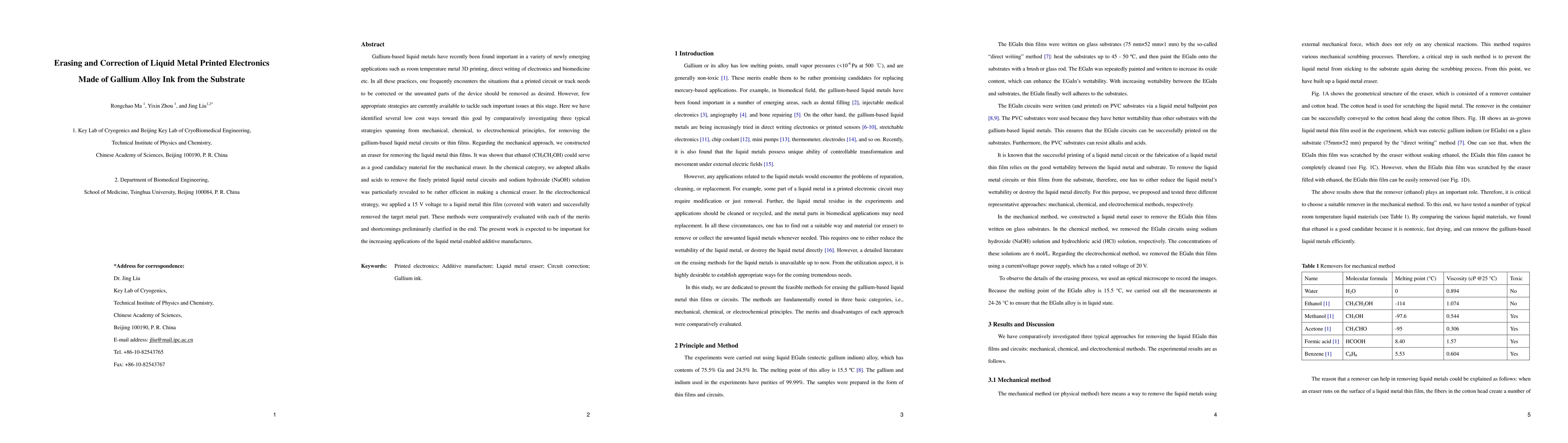 Gallium-based liquid metals have recently been found important in a variety of newly emerging applications such as room temperature metal 3D printing, direct writing of electronics and biomedicine etc. In all these practices, one frequently encounters the situations that a printed circuit or track needs to be corrected or the unwanted parts of the device should be removed as desired. However, few appropriate strategies are currently available to tackle such important issues at this stage. Here we have identified several low cost ways toward this goal by comparatively investigating three typical strategies spanning from mechanical, chemical, to electrochemical principles, for removing the gallium-based liquid metal circuits or thin films. Regarding the mechanical approach, we constructed an eraser for removing the liquid metal thin films. It was shown that ethanol (CH3CH2OH) could serve as a good candidacy material for the mechanical eraser. In the chemical category, we adopted alkalis and acids to remove the finely printed liquid metal circuits and sodium hydroxide (NaOH) solution was particularly revealed to be rather efficient in making a chemical eraser. In the electrochemical strategy, we applied a 15 V voltage to a liquid metal thin film (covered with water) and successfully removed the target metal part. These methods were comparatively evaluated with each of the merits and shortcomings preliminarily clarified in the end. The present work is expected to be important for the increasing applications of the liquid metal enabled additive manufactures.