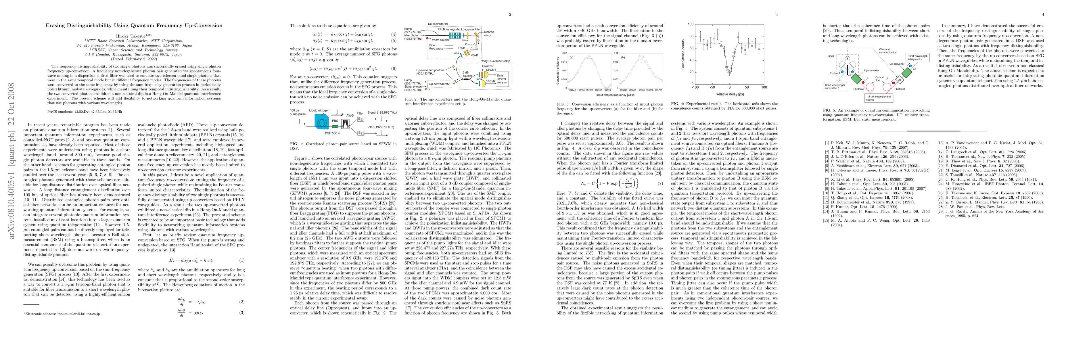 This paper demonstrates the successful erasure of frequency distinguishability in two single photons through quantum frequency up-conversion using sum frequency generation in periodically poled lithium niobate waveguides. The converted photons maintained temporal indistinguishability, resulting in a non-classical dip in a Hong-Ou-Mandel interference experiment, enhancing flexibility in quantum information networking.