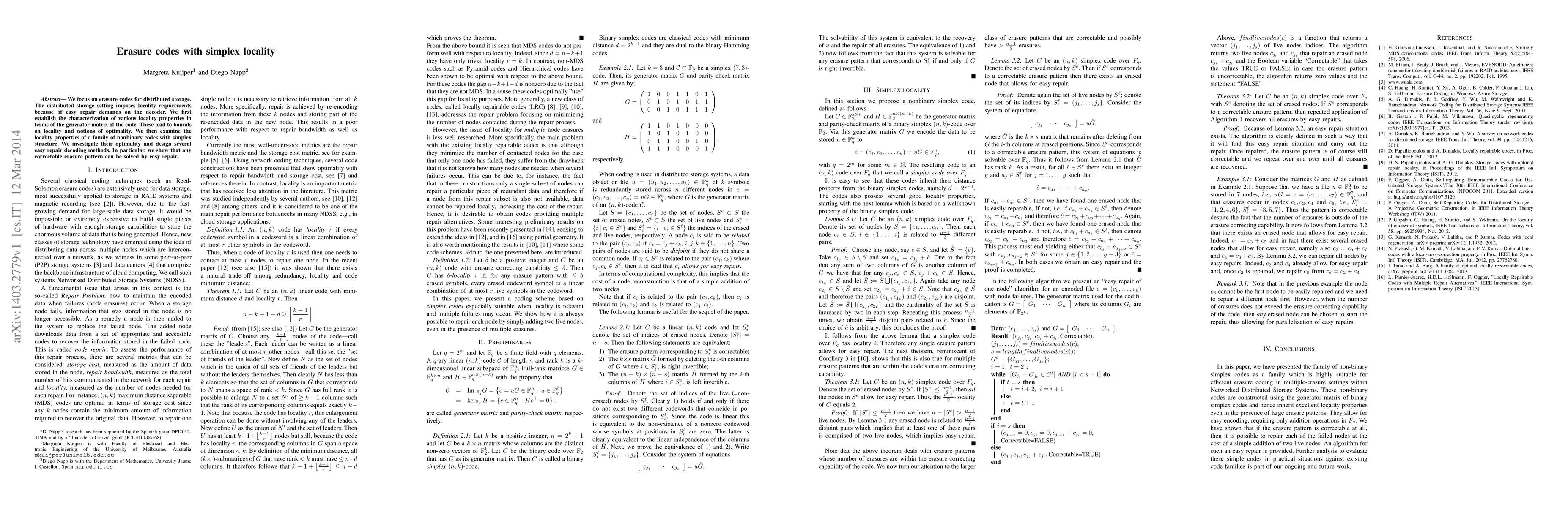 This paper explores erasure codes for distributed storage with locality properties for efficient data repair. It characterizes various locality types and examines non-binary simplex codes, demonstrating their optimality and presenting methods for straightforward erasure correction.