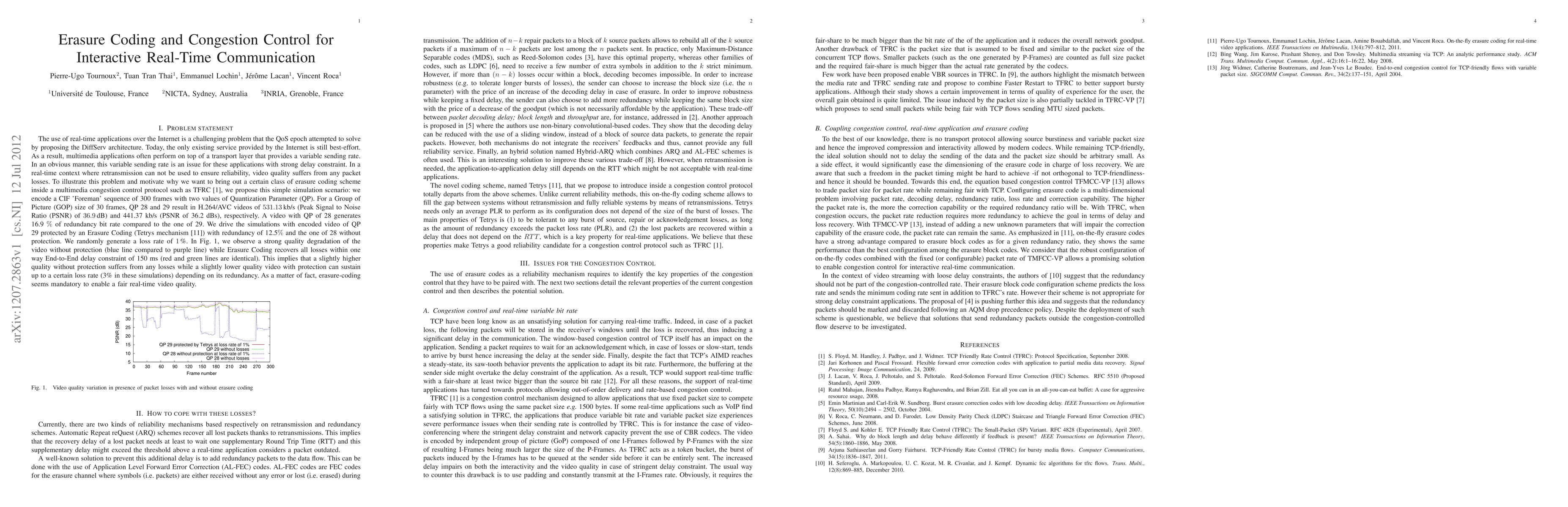 This paper addresses the challenges of real-time multimedia applications over best-effort networks, emphasizing the need for reliable data transmission without retransmission. It proposes integrating erasure coding into congestion control protocols like TFRC to enhance video quality by mitigating packet loss effects.