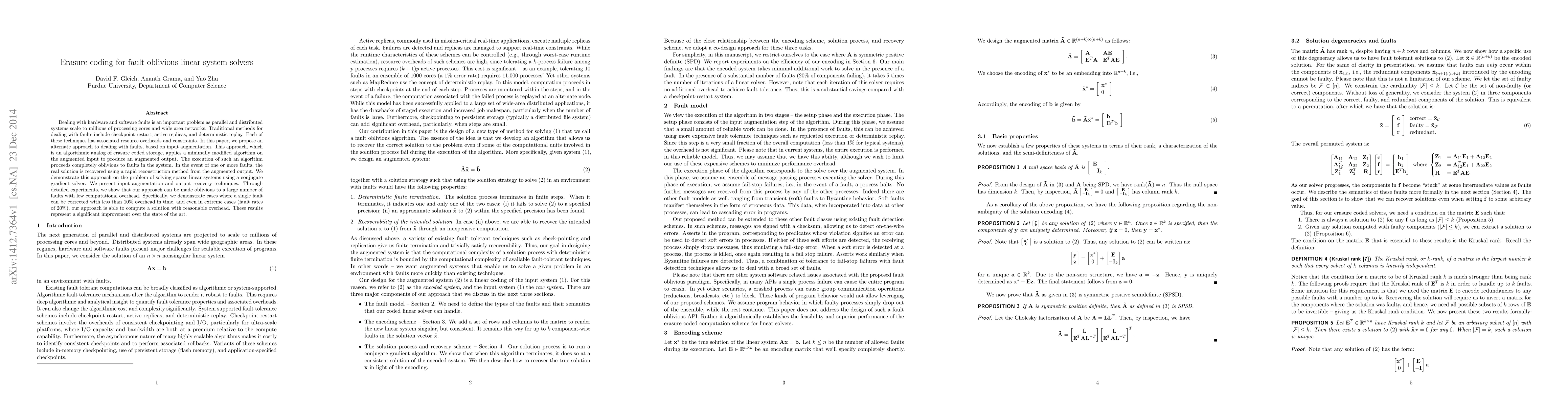 Dealing with hardware and software faults is an important problem as parallel and distributed systems scale to millions of processing cores and wide area networks. Traditional methods for dealing with faults include checkpoint-restart, active replicas, and deterministic replay. Each of these techniques has associated resource overheads and constraints. In this paper, we propose an alternate approach to dealing with faults, based on input augmentation. This approach, which is an algorithmic analog of erasure coded storage, applies a minimally modified algorithm on the augmented input to produce an augmented output. The execution of such an algorithm proceeds completely oblivious to faults in the system. In the event of one or more faults, the real solution is recovered using a rapid reconstruction method from the augmented output. We demonstrate this approach on the problem of solving sparse linear systems using a conjugate gradient solver. We present input augmentation and output recovery techniques. Through detailed experiments, we show that our approach can be made oblivious to a large number of faults with low computational overhead. Specifically, we demonstrate cases where a single fault can be corrected with less than 10% overhead in time, and even in extreme cases (fault rates of 20%), our approach is able to compute a solution with reasonable overhead. These results represent a significant improvement over the state of the art.