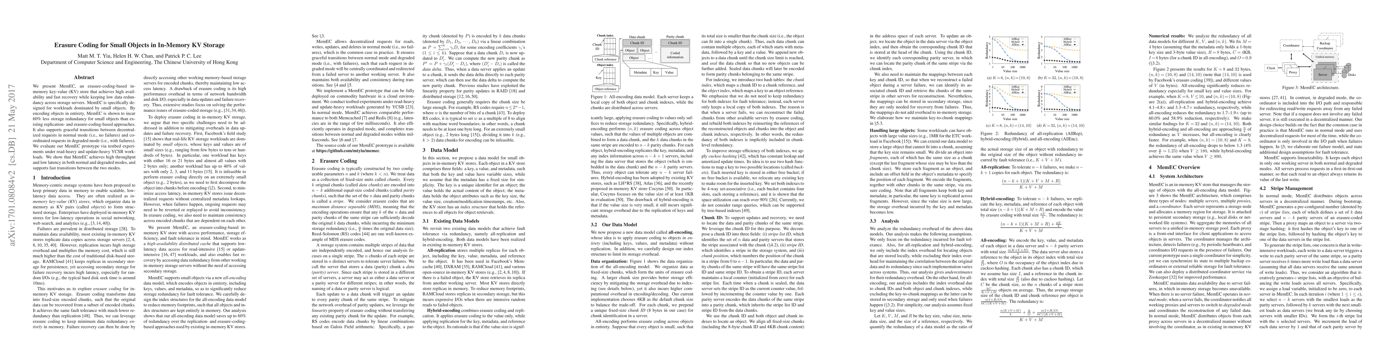 MemEC is an erasure-coding-based in-memory KV store designed for small objects, achieving high availability and fast recovery with reduced data redundancy. It supports smooth transitions between normal and degraded modes, demonstrating high throughput and low latency under various workloads.