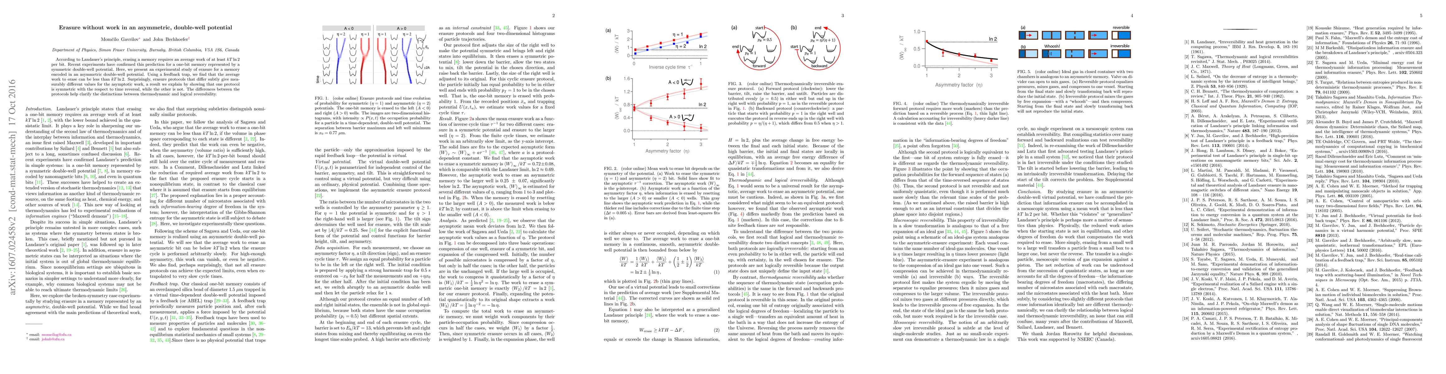 According to Landauer's principle, erasing a memory requires an average work of at least $kT\ln2$ per bit. Recent experiments have confirmed this prediction for a one-bit memory represented by a symmetric double-well potential. Here, we present an experimental study of erasure for a memory encoded in an asymmetric double-well potential. Using a feedback trap, we find that the average work to erase can be less than $kT\ln2$. Surprisingly, erasure protocols that differ subtly give measurably different values for the asymptotic work, a result we explain by showing that one protocol is symmetric with the respect to time reversal, while the other is not. The differences between the protocols help clarify the distinctions between thermodynamic and logical reversibility.