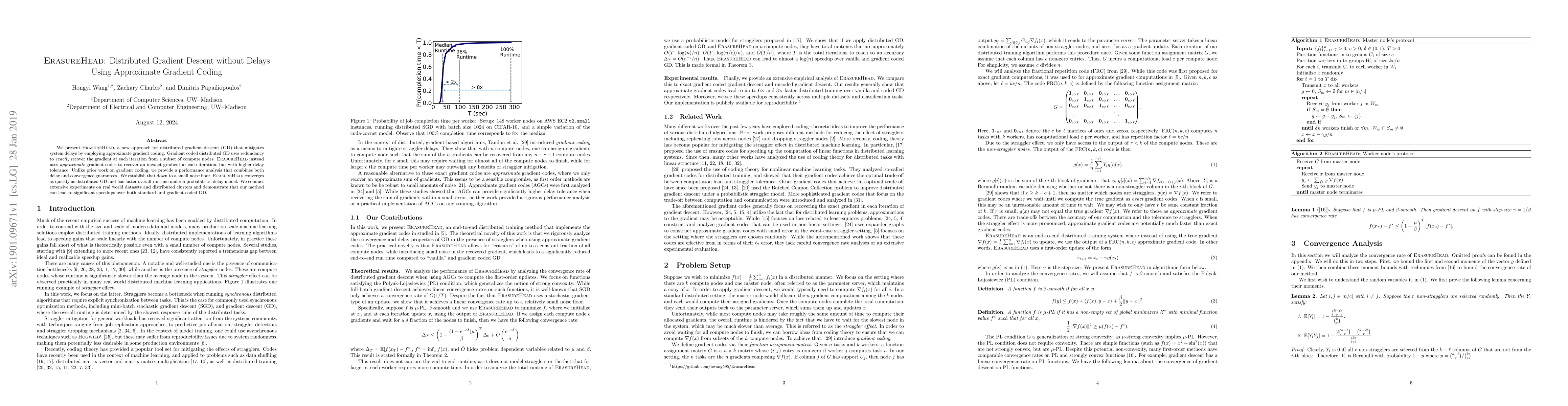 ErasureHead introduces a novel distributed gradient descent method that leverages approximate gradient coding to reduce delays, providing both delay and convergence guarantees. Experiments show significant speedups compared to standard and gradient coded gradient descent methods.