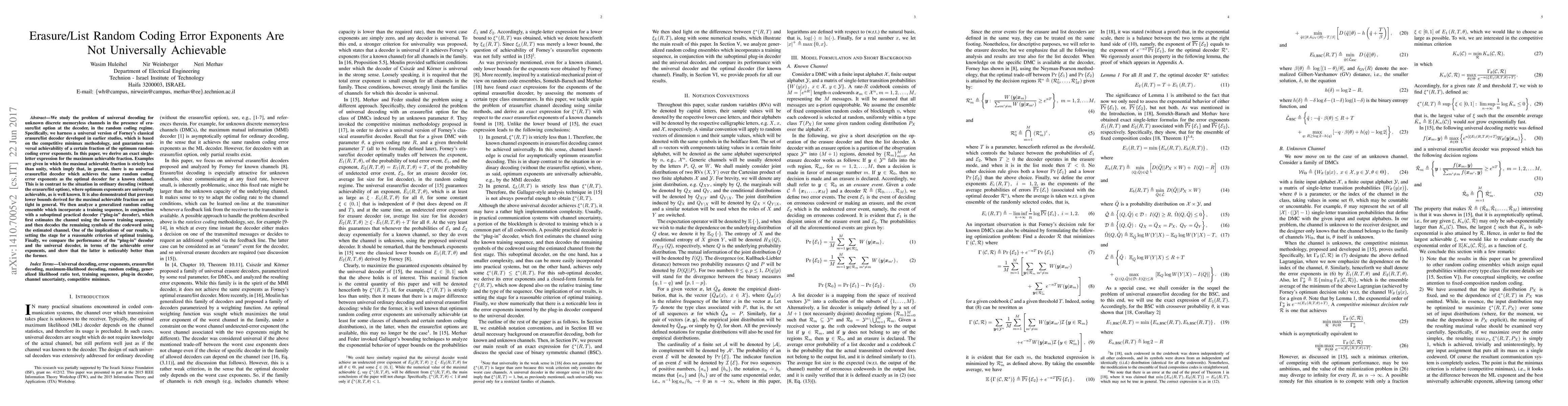 This paper investigates the universal decoding of unknown discrete memoryless channels with erasure/list decoding, finding that universal erasure/list random coding error exponents are not universally achievable. It demonstrates that previous lower bounds are not tight and introduces a "plug-in" decoder that performs better than the universal decoder in terms of achievable error exponents.