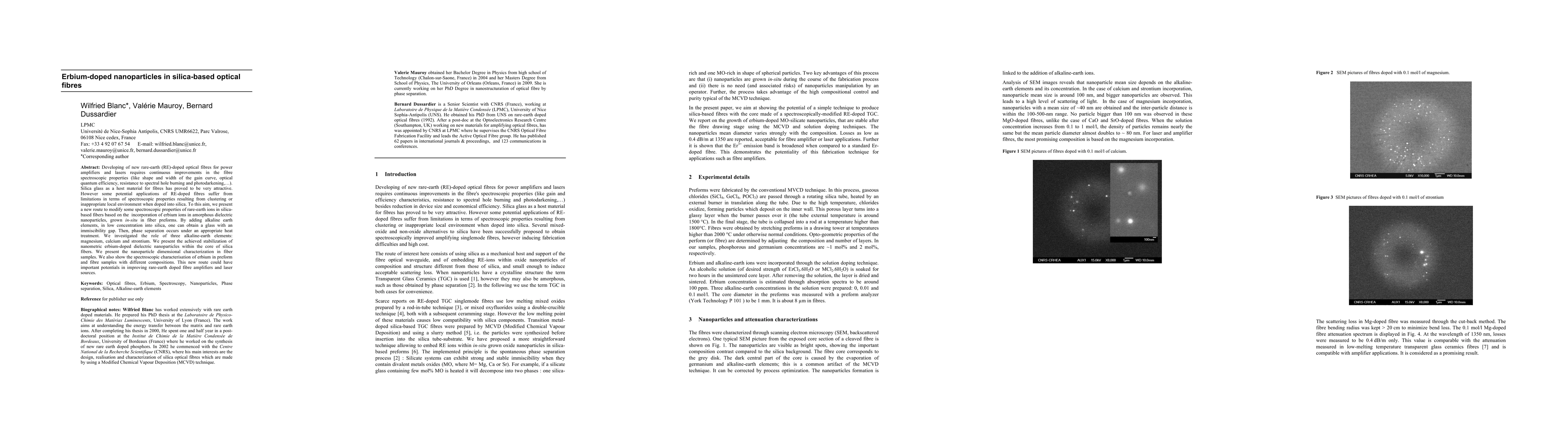 The paper investigates a novel method to enhance the spectroscopic properties of erbium-doped silica-based optical fibres by incorporating erbium ions into in-situ grown amorphous dielectric nanoparticles. The study explores the stabilization of these nanoparticles through phase separation in glasses doped with alkaline earth elements, presenting characterization of their dimensions and spectroscopic properties, which could improve the performance of fibre amplifiers and lasers.
