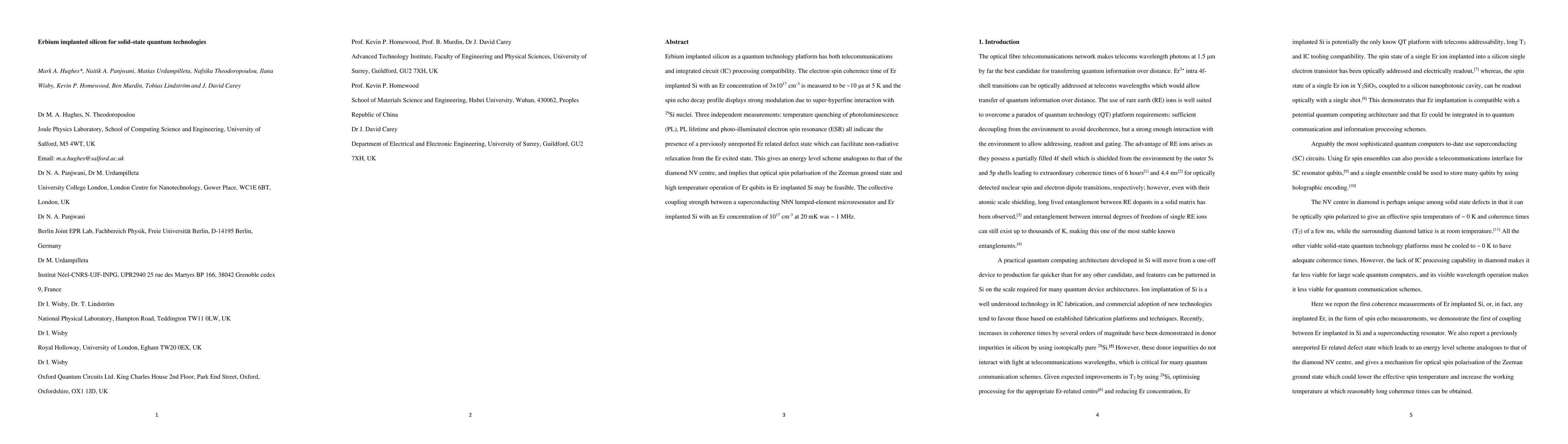 Erbium implanted silicon demonstrates promising electron spin coherence for quantum technologies, with an electron spin coherence time of ~10 μs at 5 K and potential for high-temperature operation due to a new Er-related defect state. Collective coupling strength between Er-Si and a superconducting NbN microresonator is ~1 MHz at 20 mK.