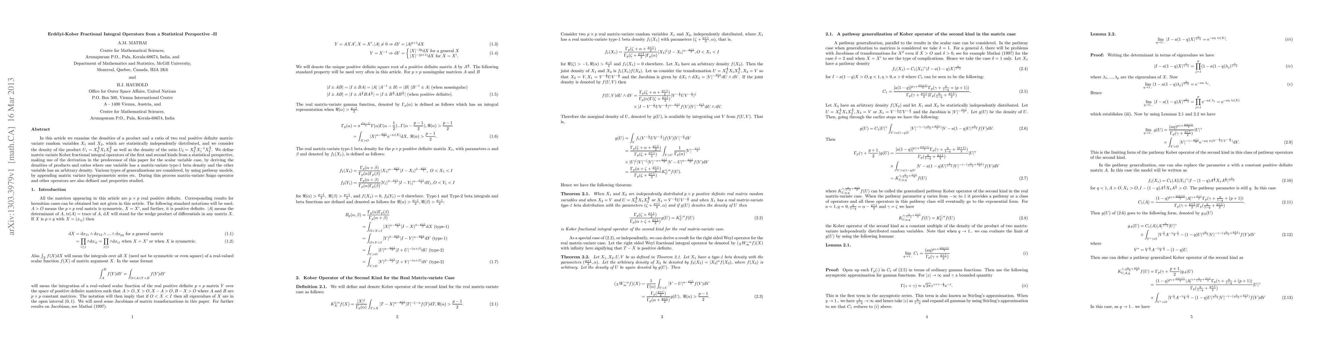 In this article we examine the densities of a product and a ratio of two real positive definite matrix-variate random variables $X_1$ and $X_2$, which are statistically independently distributed, and we consider the density of the product $U_1=X_2^{1\over2}X_1X_2^{1\over2}$ as well as the density of the ratio $U_2=X_2^{1\over2}X_1^{-1}X_2^{1\over2}$. We define matrix-variate Kober fractional integral operators of the first and second kinds from a statistical perspective, making use of the derivation in the predecessor of this paper for the scalar variable case, by deriving the densities of products and ratios where one variable has a matrix-variate type-1 beta density and the other variable has an arbitrary density. Various types of generalizations are considered, by using pathway models, by appending matrix variate hypergeometric series etc. During this process matrix-variate Saigo operator and other operators are also defined and properties studied.
