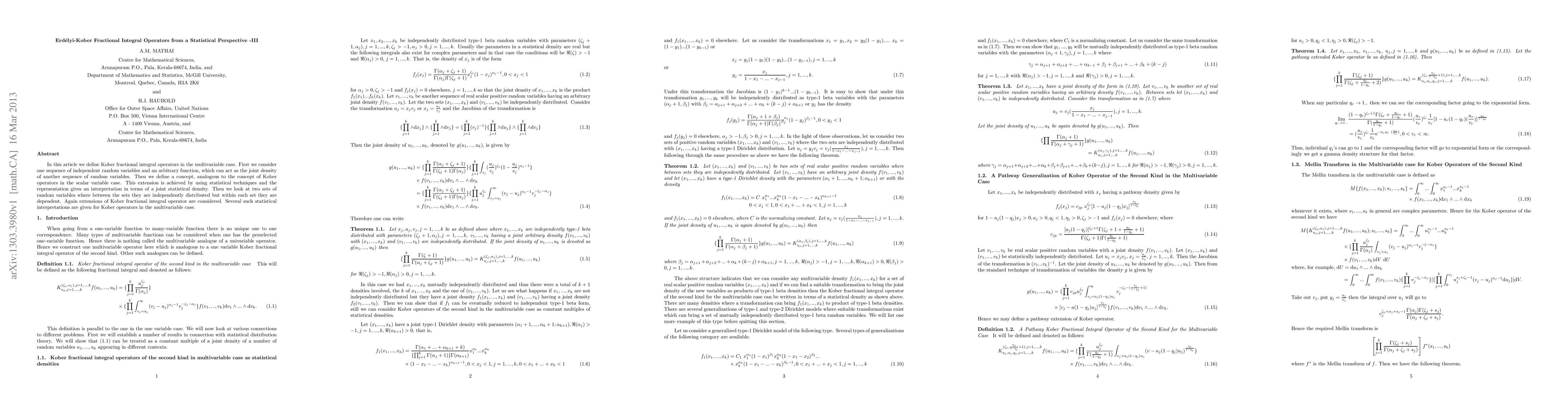 The paper extends Kober fractional integral operators to the multivariable case using statistical techniques, defining concepts analogous to scalar variable cases through transformations and joint statistical densities.