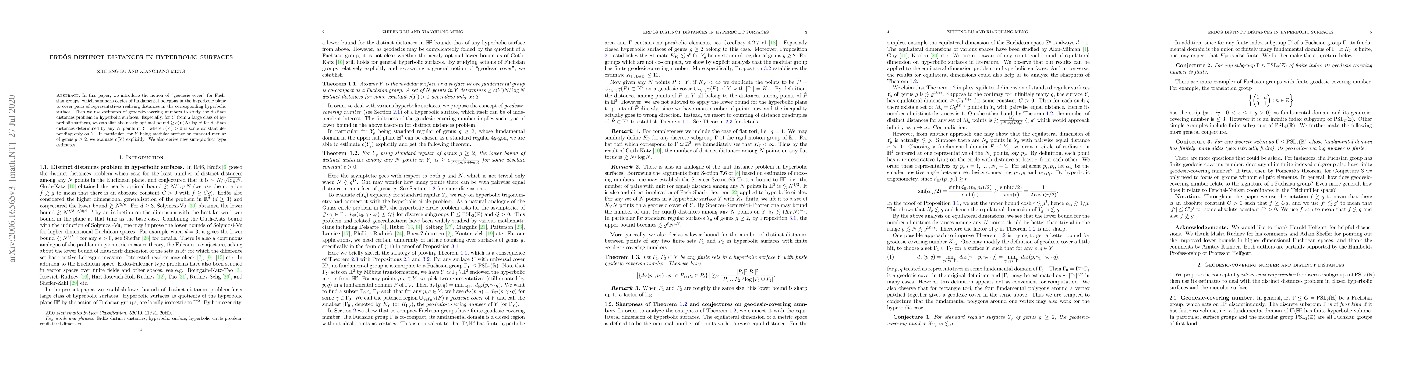 Researchers develop a new method to study distances in hyperbolic surfaces using estimates of geodesic-covering numbers, establishing nearly optimal bounds for distinct distances determined by points in the surface.