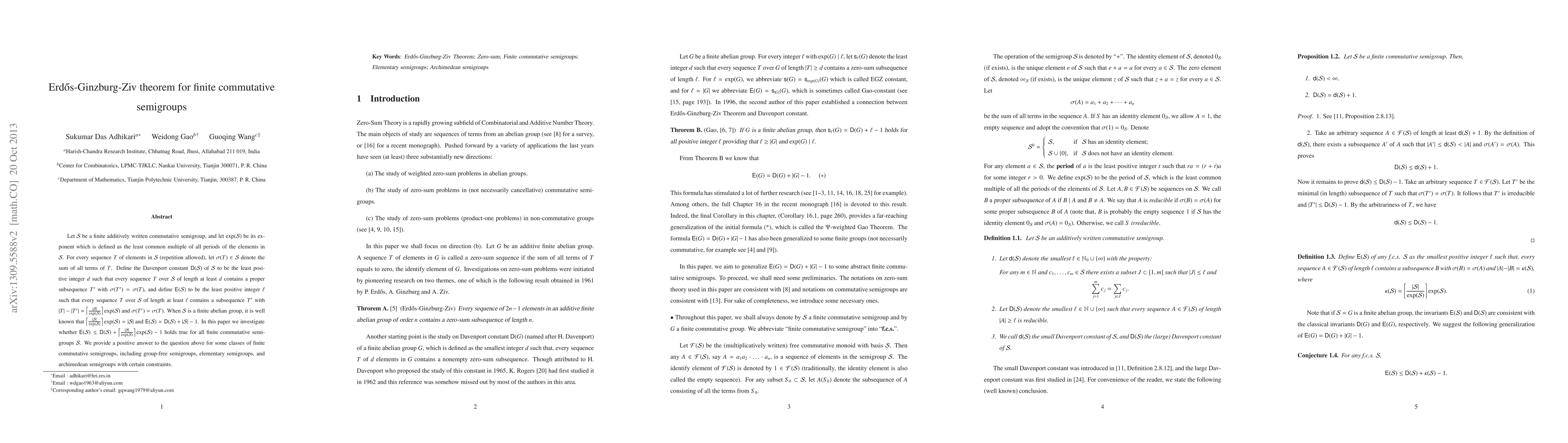 Let $\mathcal{S}$ be a finite commutative semigroup written additively, and let $\exp(\mathcal{S})$ be its exponent which is defined as the least common multiple of all periods of the elements in $\mathcal{S}$. For every sequence $T$ of elements in $\mathcal{S}$ (repetition allowed), let $\sigma(T) \in \mathcal{S}$ denote the sum of all terms of $T$. Define the Davenport constant $D(\mathcal{S})$ of $\mathcal{S}$ to be the least positive integer $d$ such that every sequence $T$ over $\mathcal{S}$ of length at least $d$ contains a proper subsequence $T'$ with $\sigma(T')=\sigma(T)$, and define the Erd\H{o}s-Ginzburg-Ziv Theorem constant $E(\mathcal{S})$ to be the least positive integer $\ell$ such that every sequence $T$ over $\mathcal{S}$ of length at least $\ell$ contains a subsequence $T'$ with $|T|-|T'|=\left\lceil\frac{|\mathcal{S}|}{\exp(\mathcal{S})}\right\rceil\exp(\mathcal{S})$ and $\sigma(T')=\sigma(T)$. When $\mathcal{S}$ is a finite abelian group, it is well known that $\left\lceil\frac{|\mathcal{S}|}{\exp(\mathcal{S})}\right\rceil\exp(\mathcal{S})=|\mathcal{S}|$ and $E(\mathcal{S})=D(\mathcal{S})+|\mathcal{S}|-1$. In this paper we investigate whether $E(\mathcal{S})\leq D(\mathcal{S})+\left\lceil\frac{|\mathcal{S}|}{\exp(\mathcal{S})}\right\rceil \exp(\mathcal{S})-1$ holds true for all finite commutative semigroups $\mathcal{S}$. We provide a positive answer to the question above for some classes of finite commutative semigroups, including group-free semigroups, elementary semigroups, and archimedean semigroups with certain constraints.